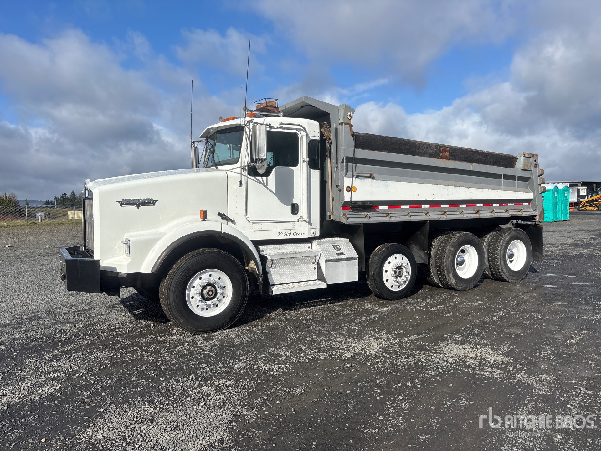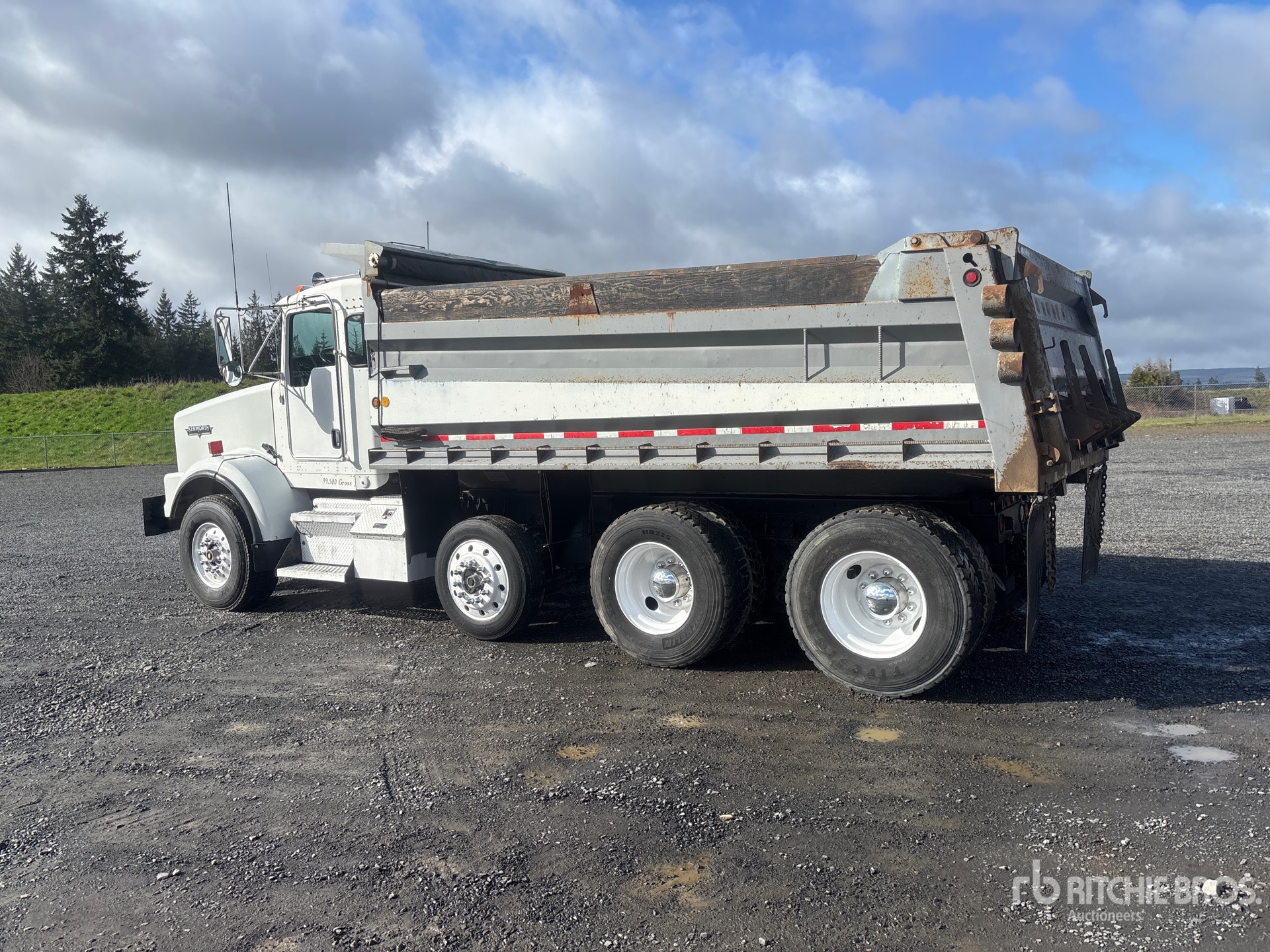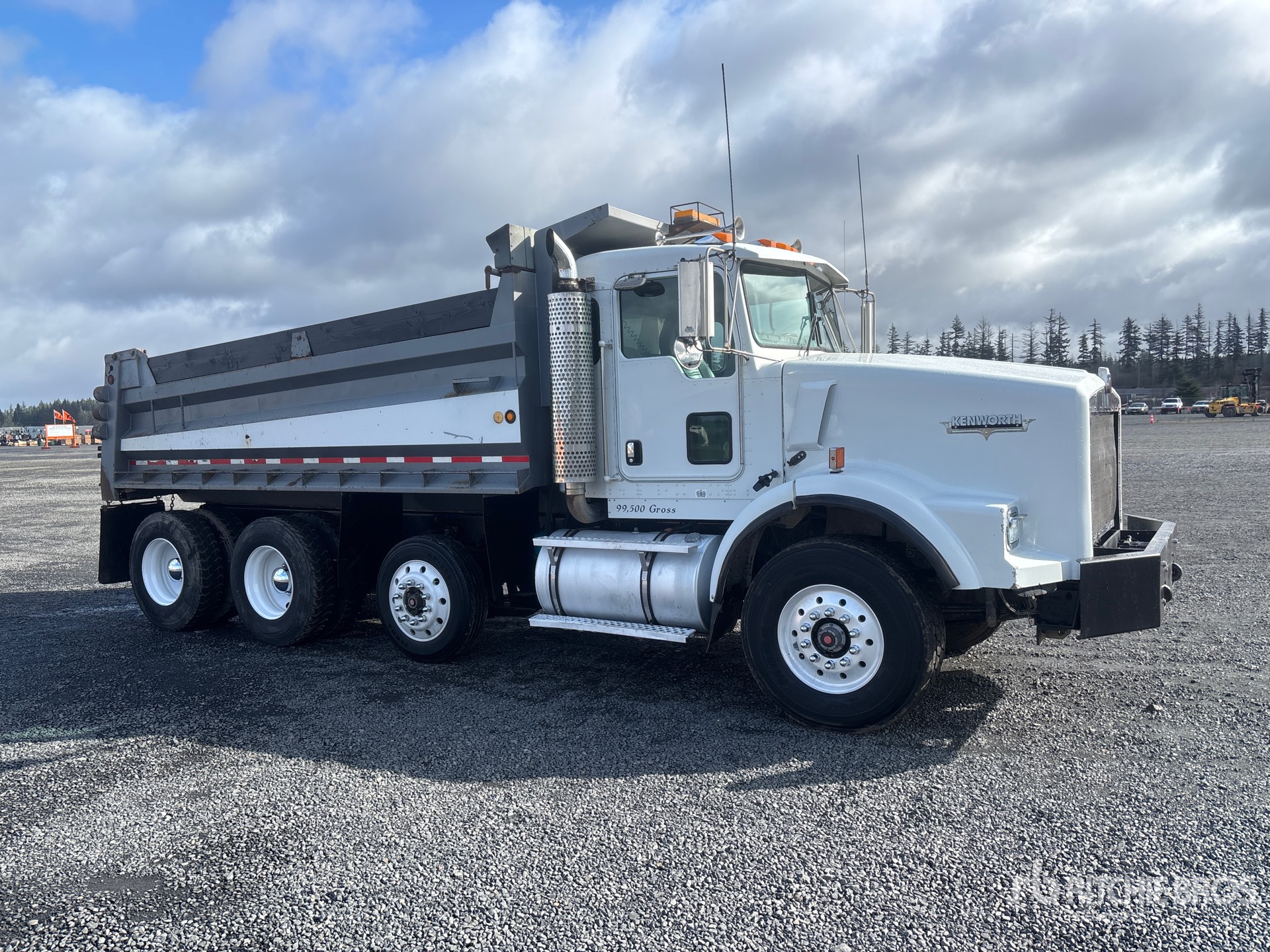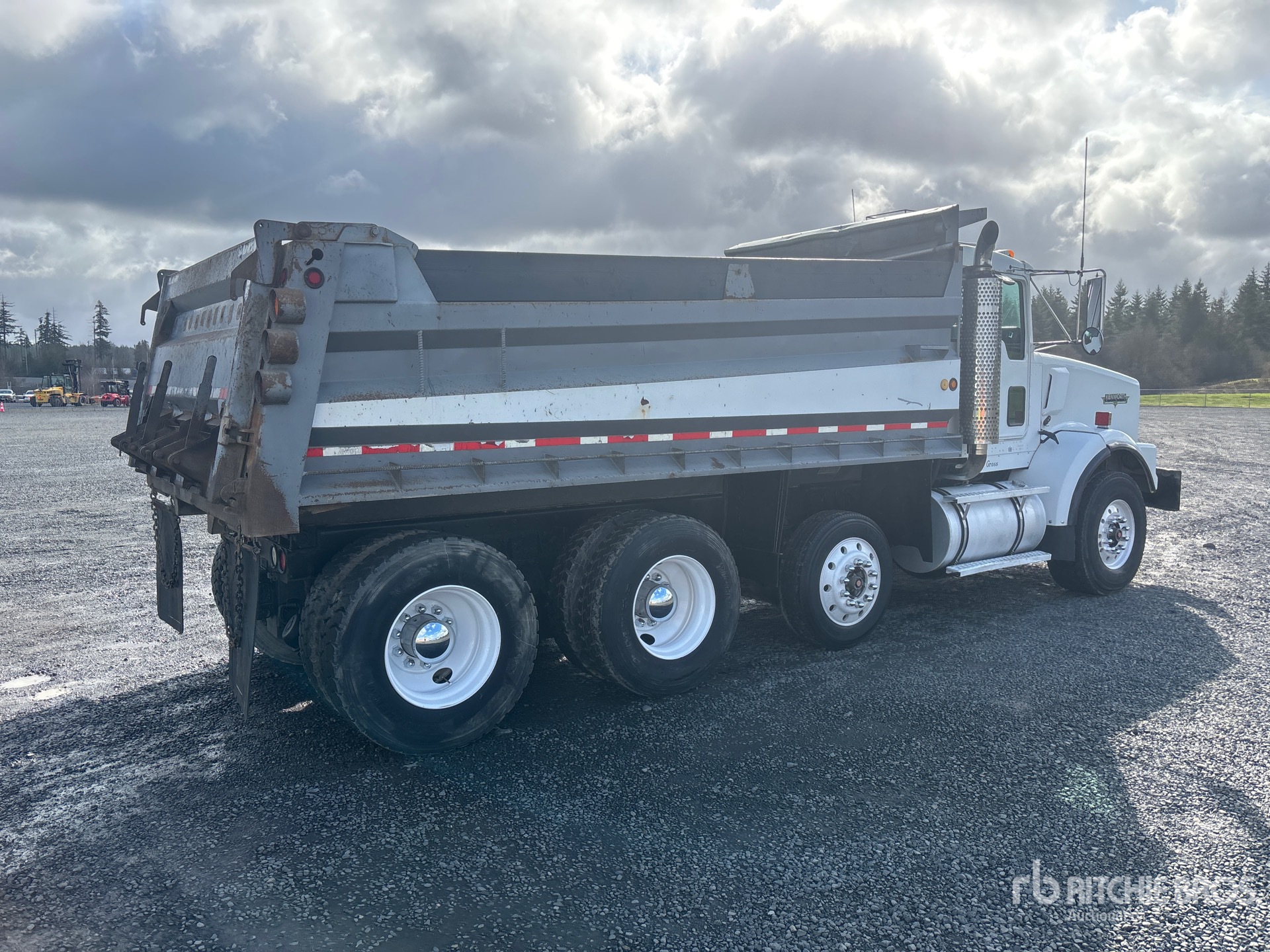 Located in Lane 8 Spot 21, Cummins 6 Cylinder Diesel 460 hp Engine, 21729 Engine hrs, Engine Brake, Eaton Fuller RTLO-16918B 18-Speed Manual Transmission, Differential Lock, 18740 lb Front Axle, 40000 lb Rears, 4.33:1 Axle Ratio, 69760 lb GVWR, Aluminum Front Wheels, 385/65R22.5 Front Tires, 11R22.5 Rear Tires, Dual Steering Boxes, Rubber over Walking Beam Suspension, 214 in Wheelbase, PTO, 16 ft Long x 3 ft High Steel Body, Manual Roll Tarp, Rear Hydraulics, Triple Tailgate Chutes, Pintle Hitch