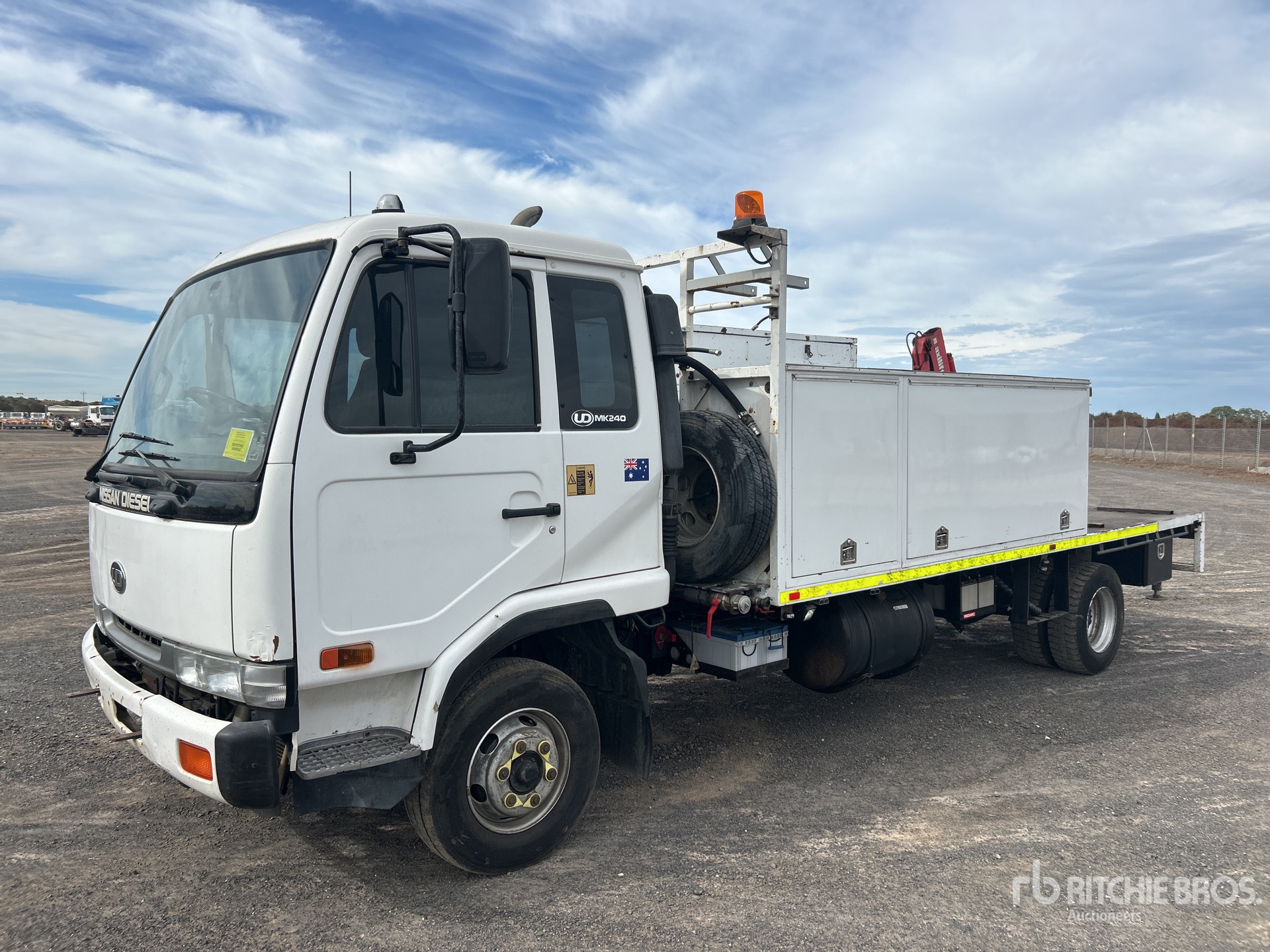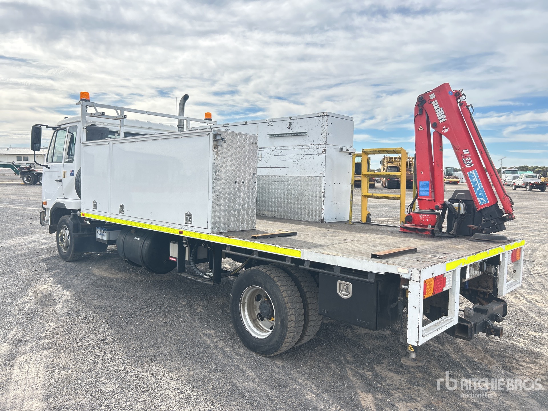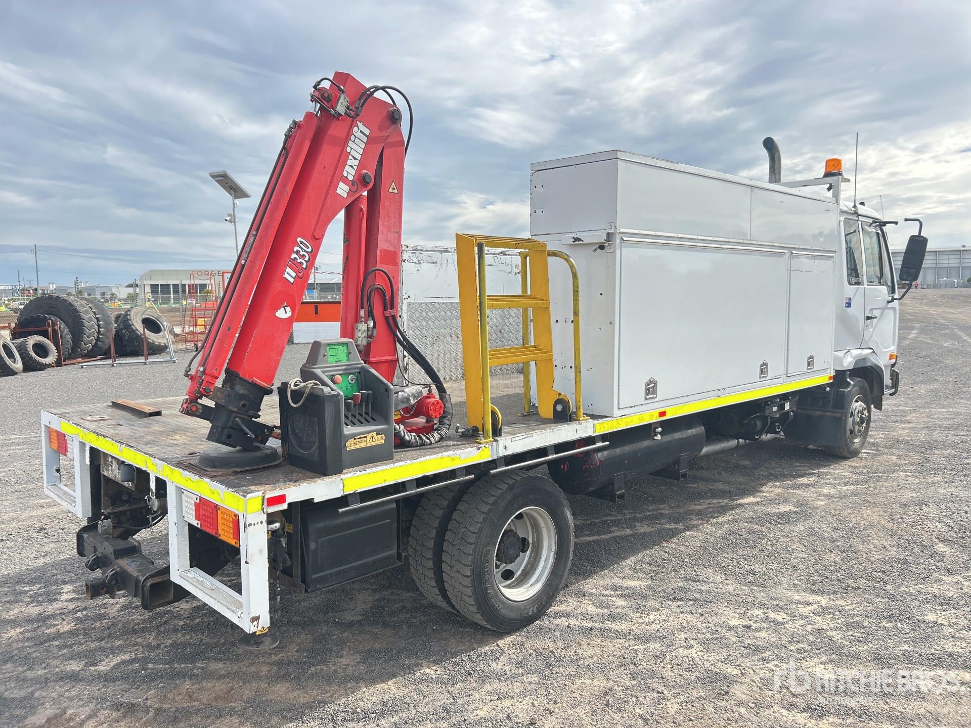 Nissan FE6TB-31 6 Cylinder 6.9 L Diesel Engine, 9692 Engine hrs, Exhaust Brake, 6-Speed Manual Transmission, 235/75R17.5 Front Tires, 235/75R17.5 Rear Tires, Spring Suspension, 4900 mm Wheelbase, PTO, 5150 mm Body, Hydraulic Stabilizers, 2013 Maxilift M330 2500 kg 3 Section Hydraulic Crane, Wired Remote Control, GVM 10.4 t