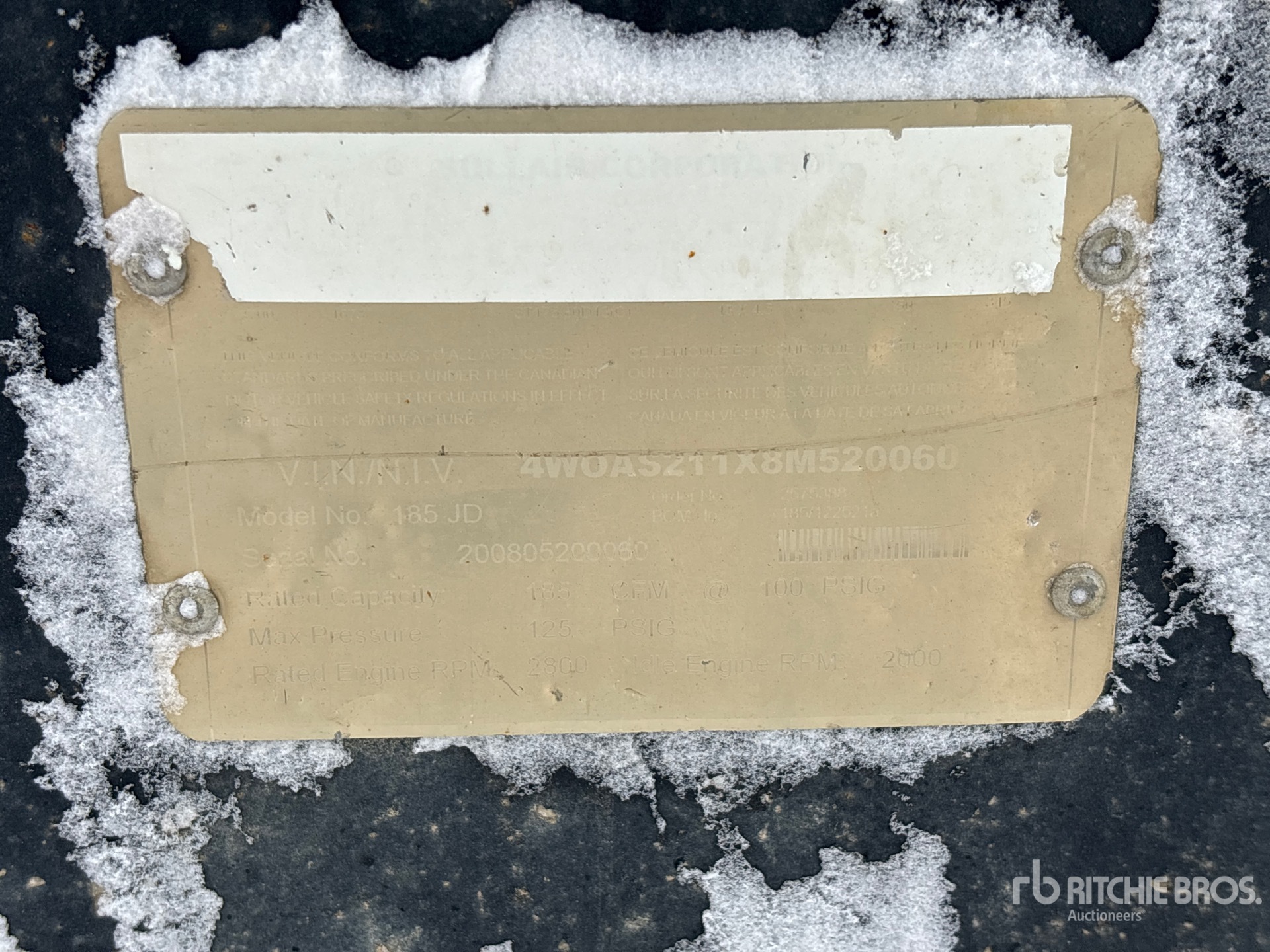 125 psi Working Pressure, 2008 US EPA Label, John Deere 4024TF270 4 Cylinder 37 kW 2.4 L Diesel Engine, Lunette Ring Carrier Trailer