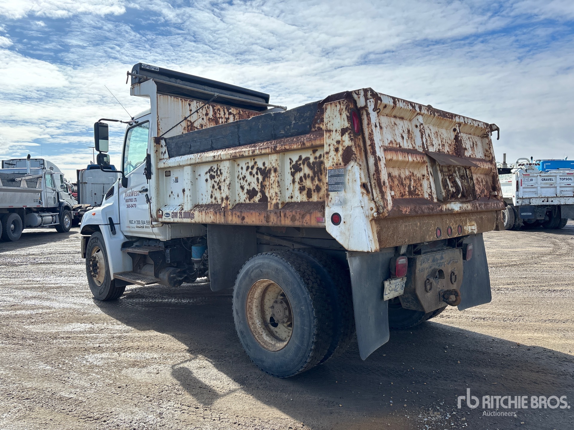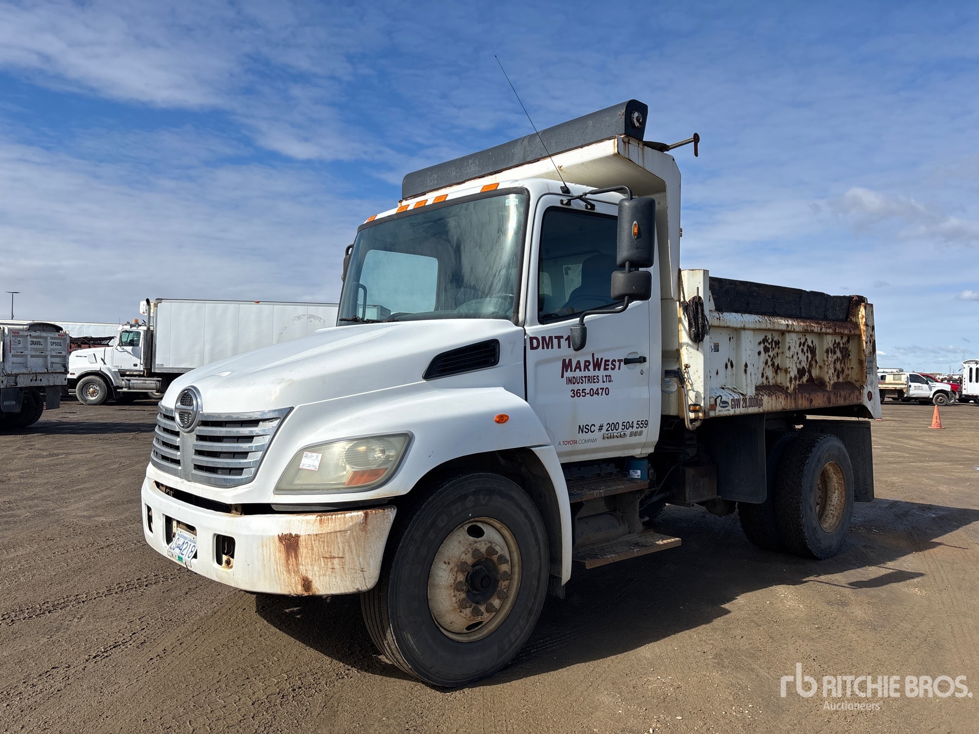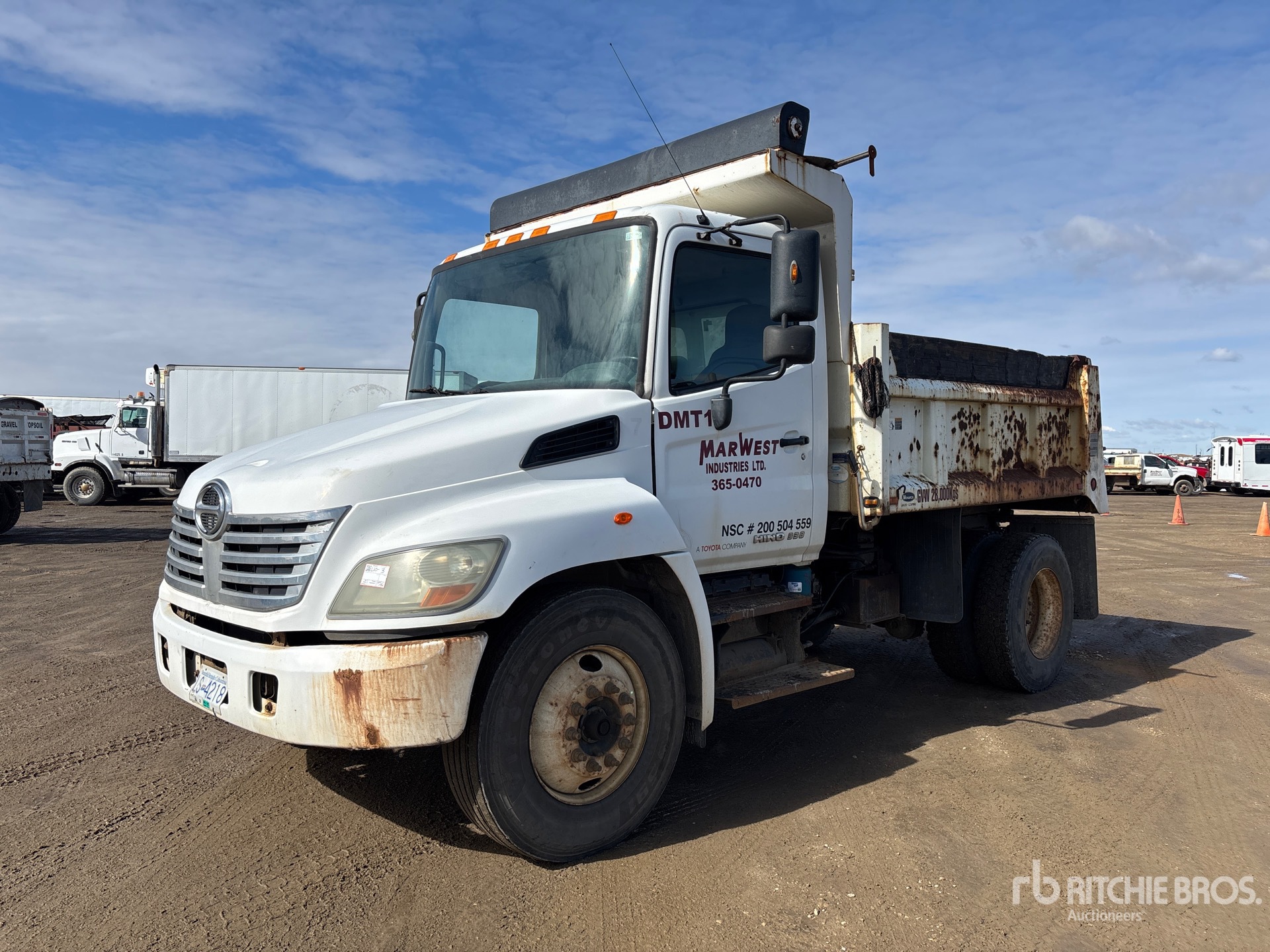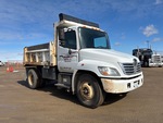 Hino J08E-TW 6 Cylinder Diesel 260 hp Engine, 2009 US EPA Label, CARB Compliant, 999 Engine hrs, Allison Automatic Transmission, 10000 lb Front Axle, 21000 lb Rears, 25950 lb GVWR, 11R22.5, Spring Suspension, 154 in Wheelbase, PTO, Marathon 10 ft Long x 3 ft High Steel Body, Manual Roll Tarp, Tailgate Chute, Pintle Hitch