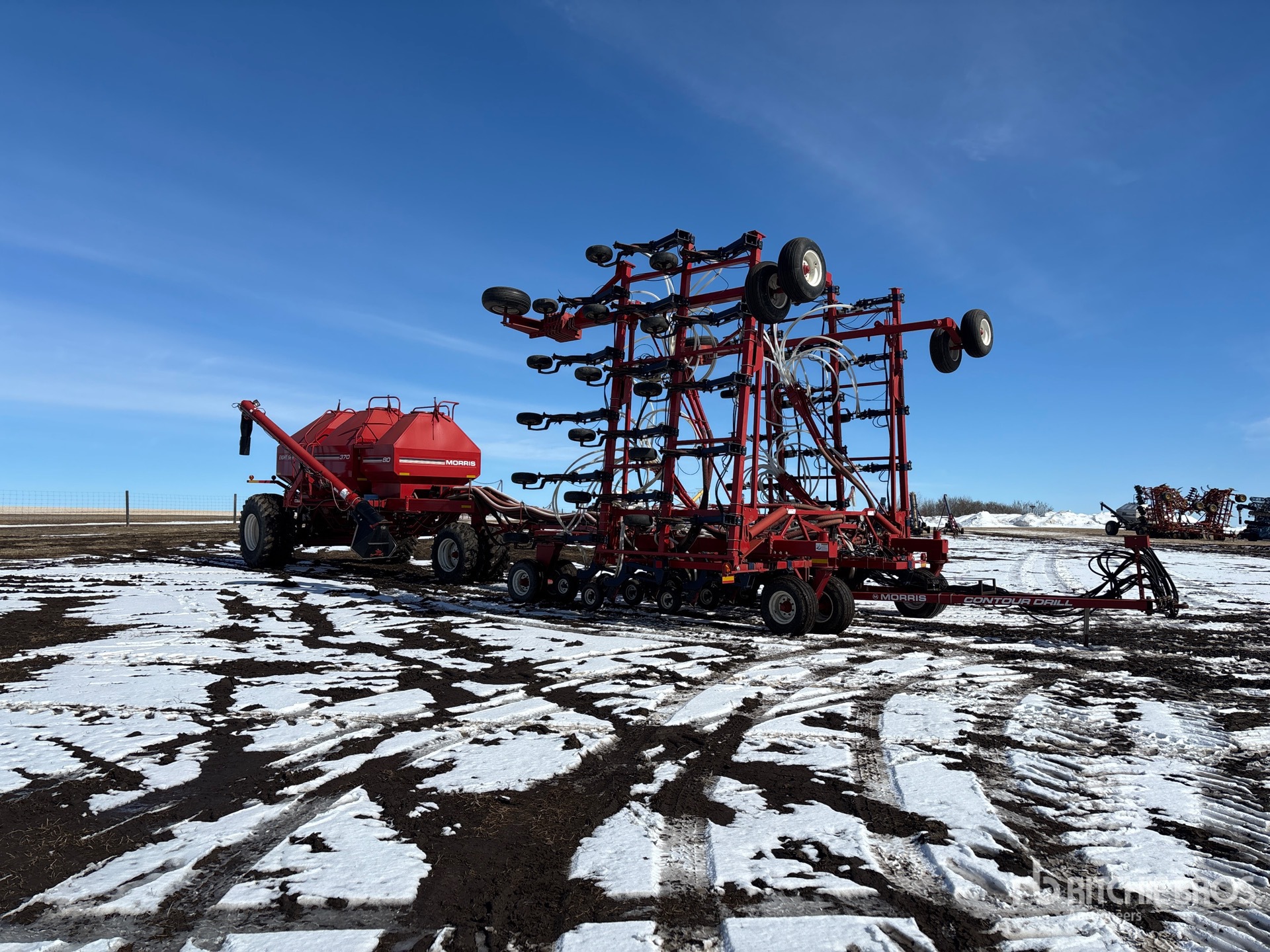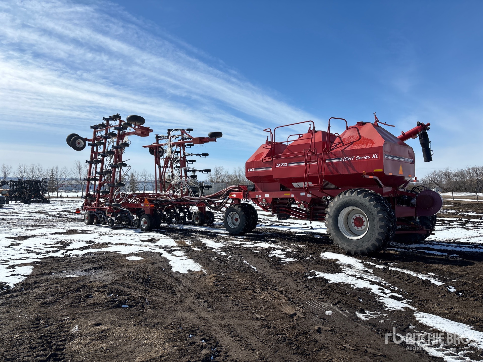 12 in Spacing, Double Shoot, NH3 Package, Semi-Pneumatic 5.5 in Packer, Morris 8370 XL 3 Compartment Tow-Behind Air Cart, Tank S/N 370100236 Single Fan, Loading System, 10 in Loading Auger, 500/70R24 Front Tires 800/65R32 Rear Tires, Rear Hitch, Raven Omniseed, Seed Treater