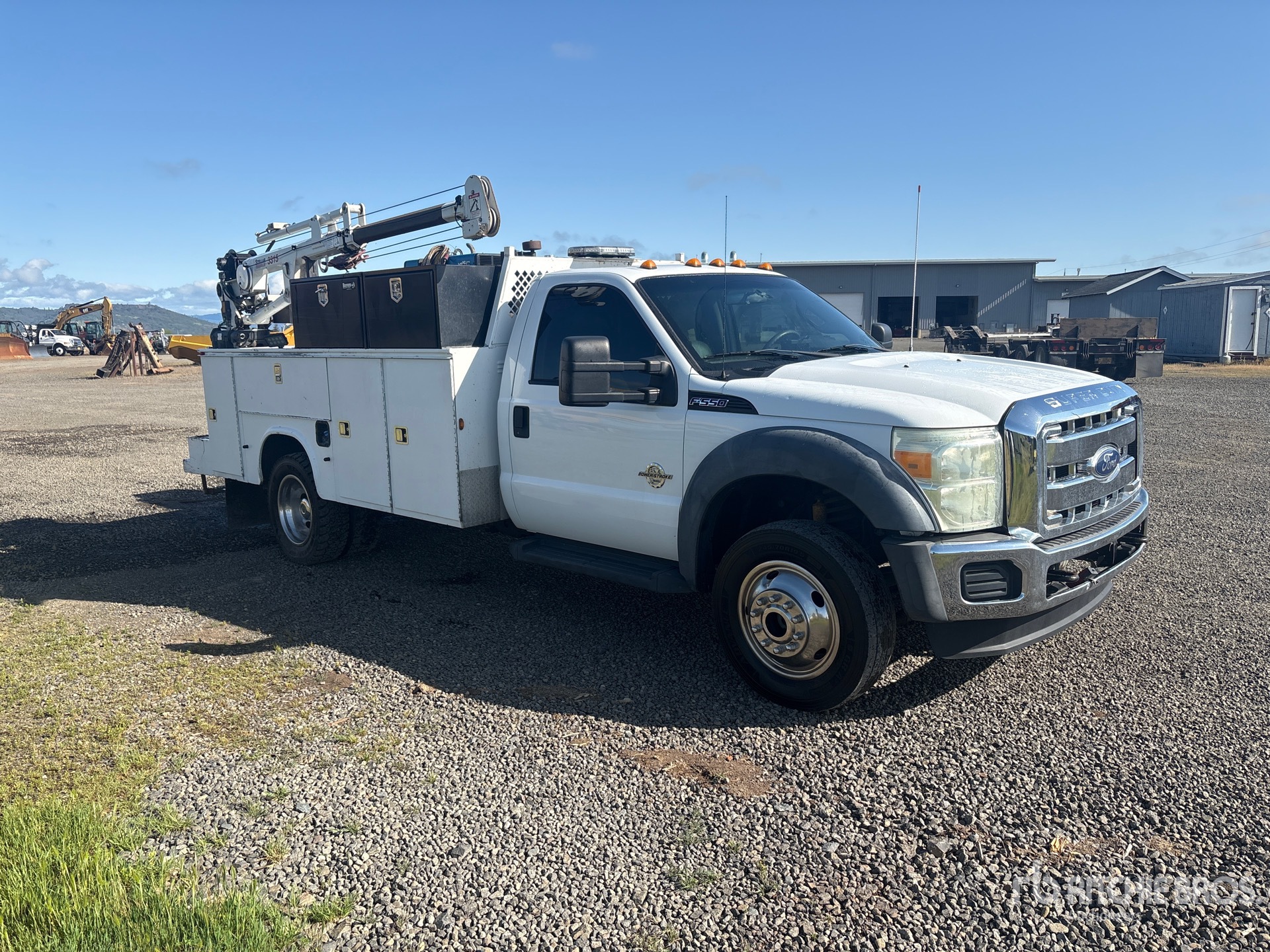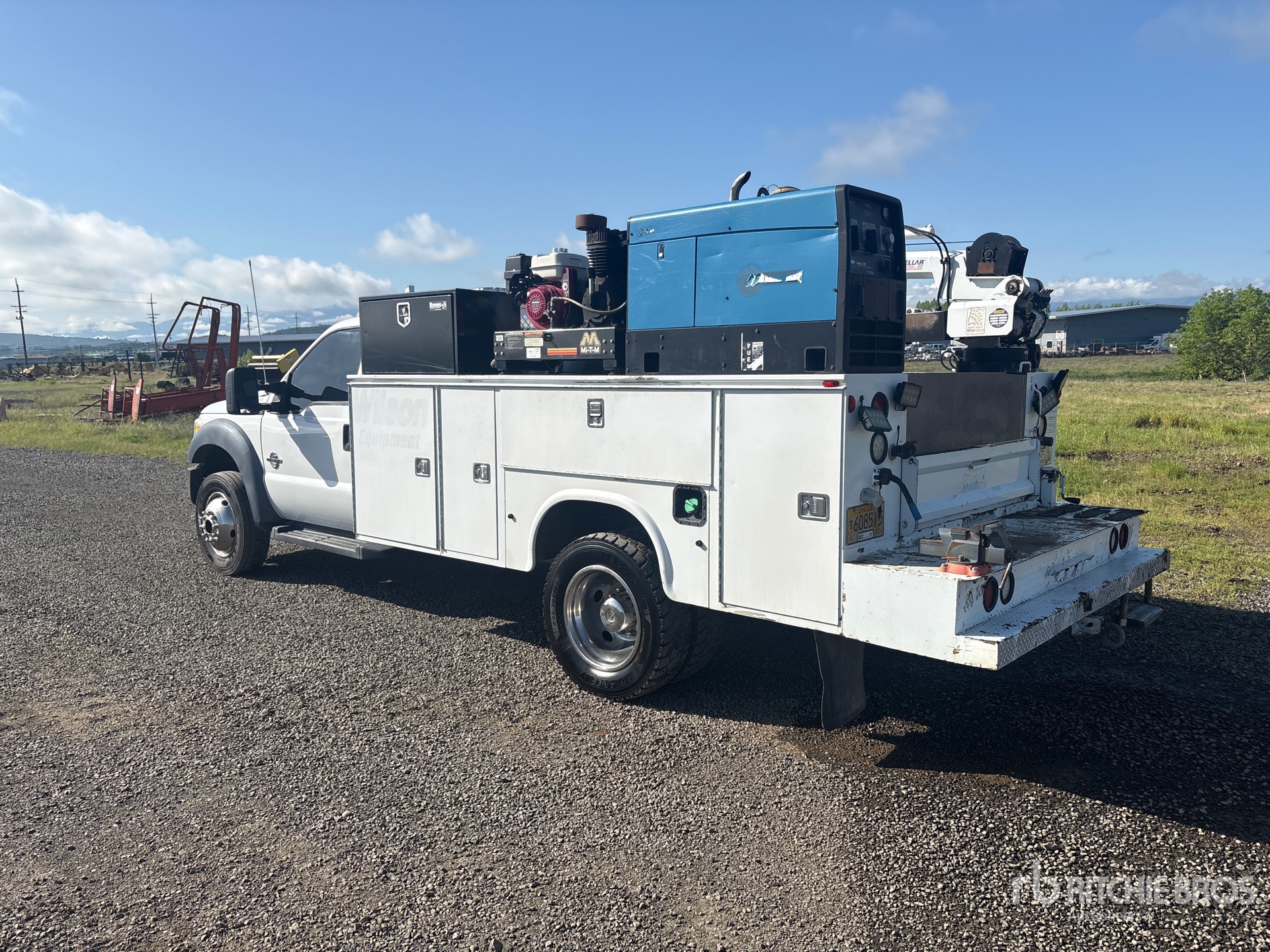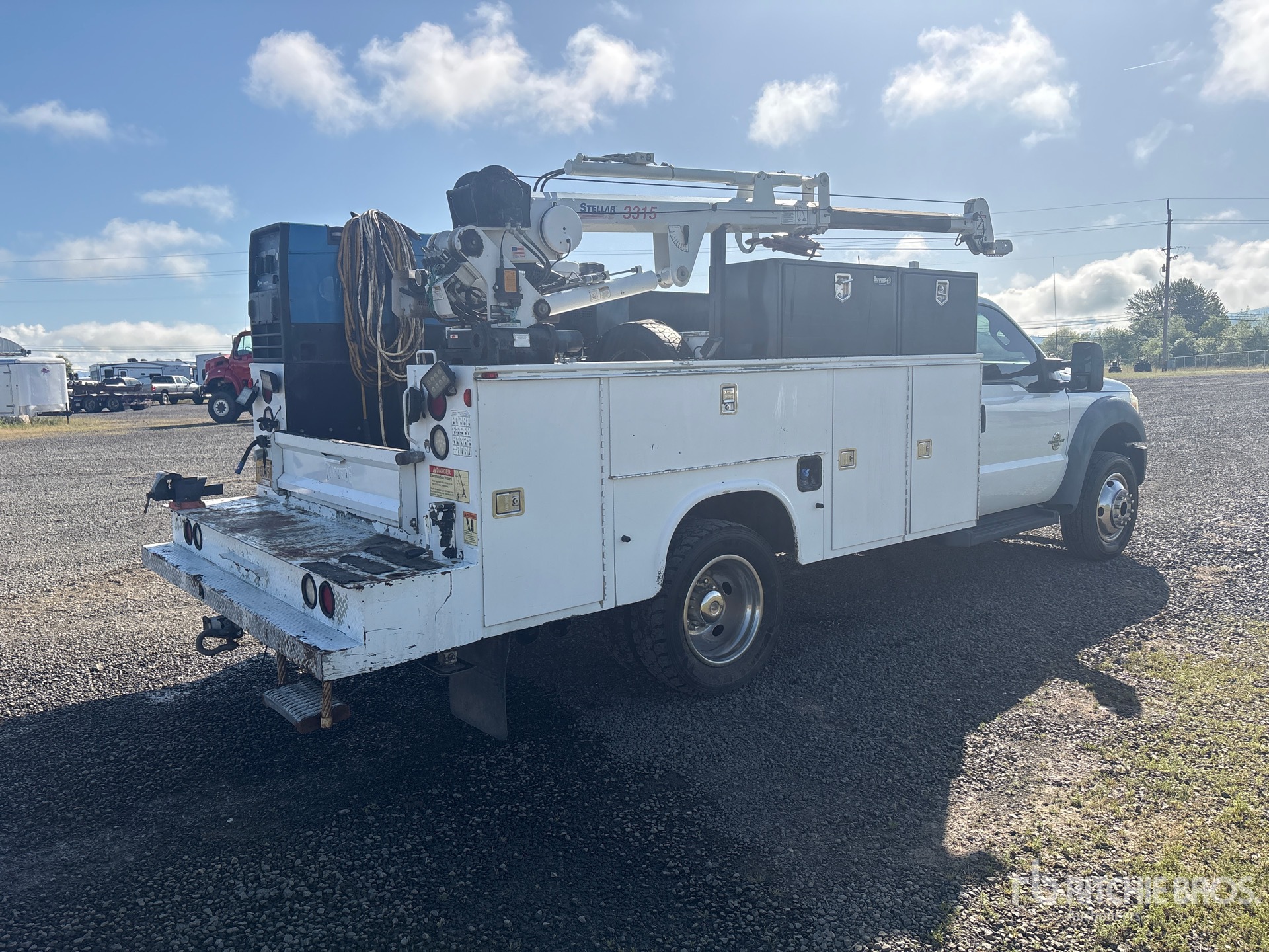 6.7 V8 Diesel 300 hp Engine, 2012 US EPA Label, Automatic Transmission, 7000 lb Front Axle, 14700 lb Rears, 19500 lb GVWR, Aluminum Wheels, 245/70R19.5, Spring Suspension, 165 in Wheelbase, Knapheide 11 ft Body, Manual Stabilizers, Stellar 3300 lb 2 Section Electric Crane, Miller Gasoline Generator Set, MITM Gasoline Air Compressor, Air Hose Reel, Miller Gasoline Welder