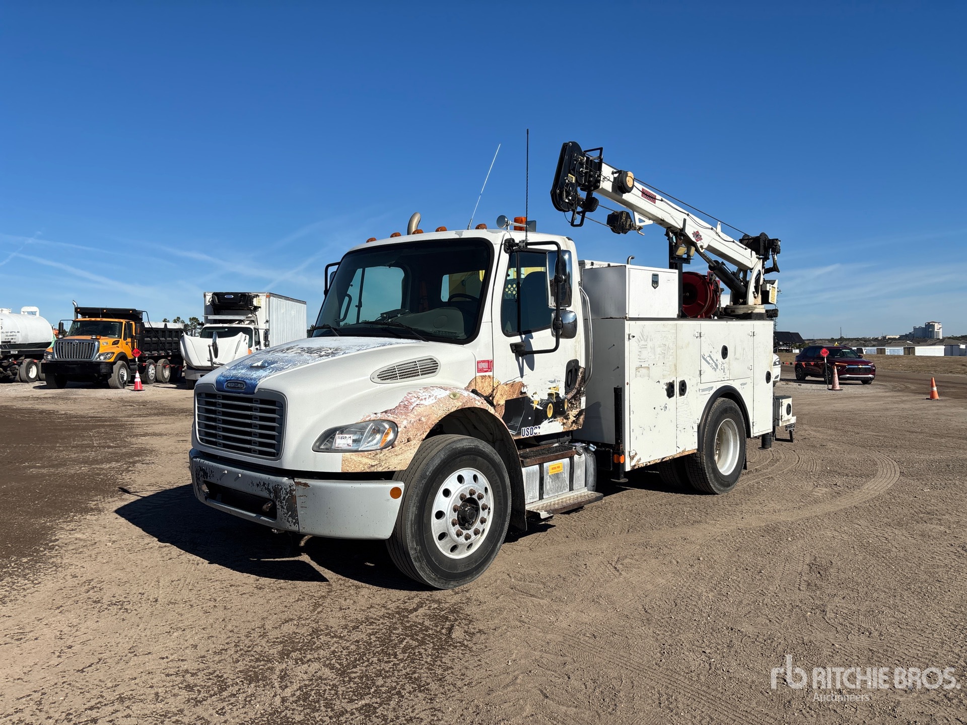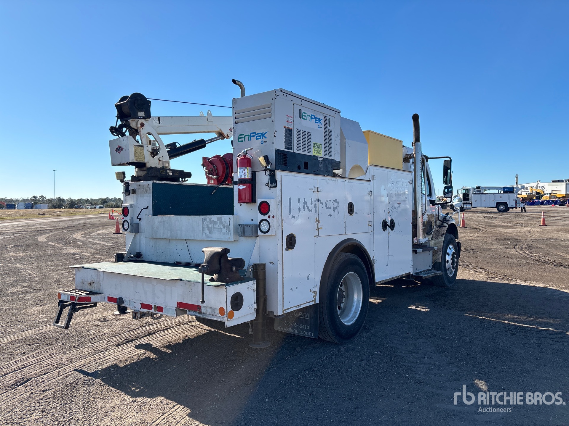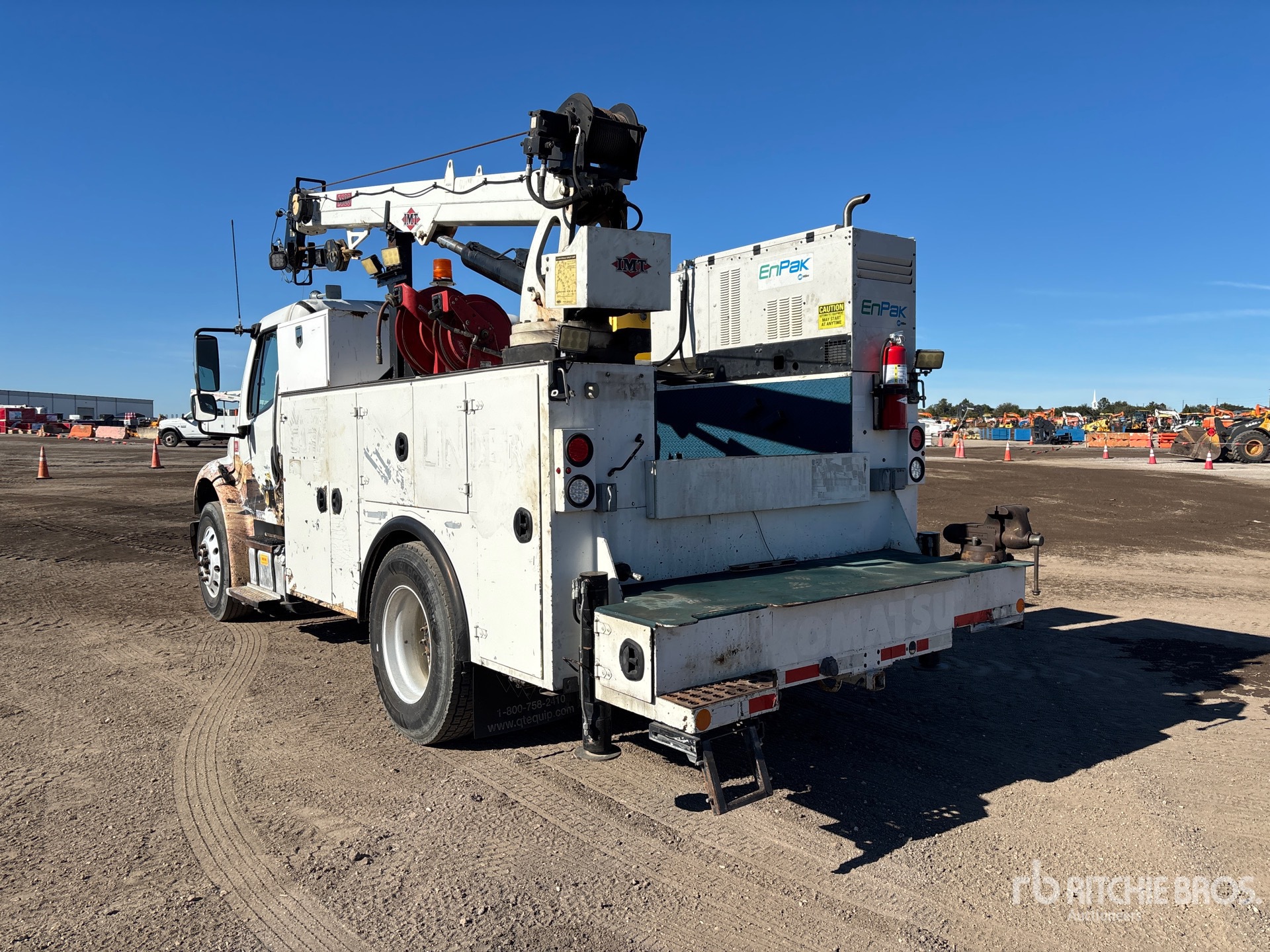 Cummins ISB 6.7 240 6.7 L Diesel 240 hp Engine, 2015 US EPA Label, Requires Diesel Exhaust Fluid, 14797 Engine hrs, Automatic Transmission, 8000 lb Front Axle, 17500 lb Rears, 25500 lb GVWR, Aluminum Wheels, 275/80R22.5 Front Tires, 295/75R22.5 Rear Tires, Spring Suspension, 156 in Wheelbase, 11 ft Body, Hydraulic Stabilizers, IMT 8600 lb 3 Section Hydraulic Crane, Wired Remote Control, Miller Enpak 6 kVA Diesel Generator Set, Miller Enpak 60 cfm Air Compressor, Air Hose Reel