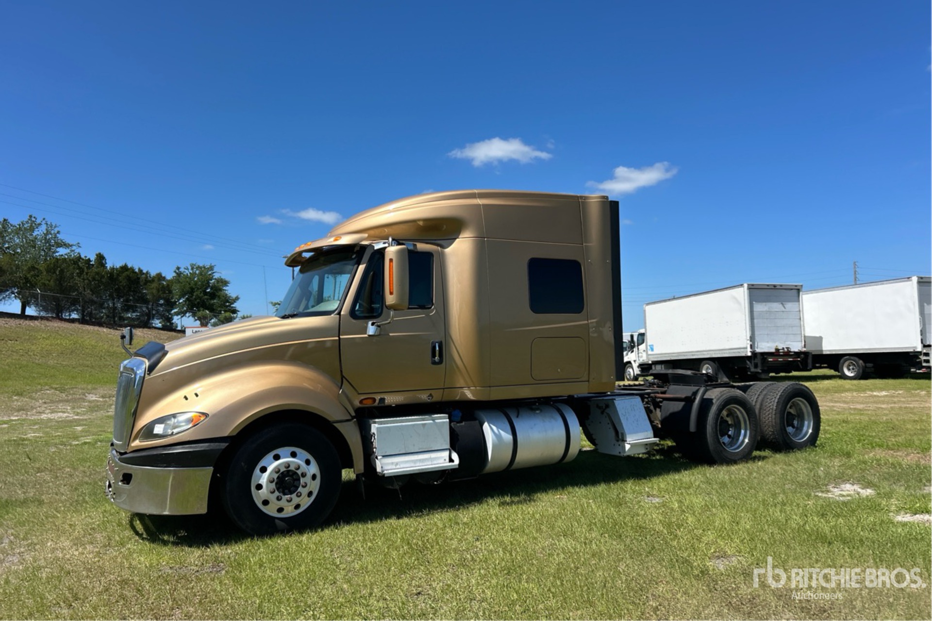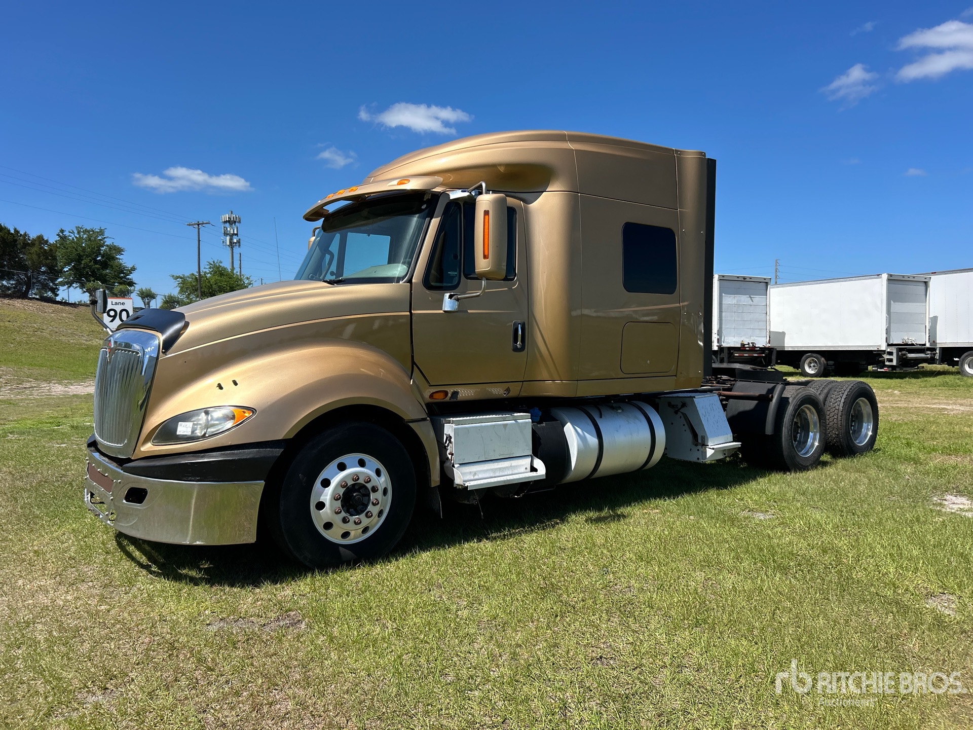 Navistar N13 450 hp Engine, 2015 US EPA Label, 19571 Engine hrs, Eaton Fuller 10-Speed Manual Transmission, 12350 lb Front Axle, 40000 lb Rears, 52350 lb GVWR, Engine Brake, Differential Lock, 56 in Mid Roof Sleeper Cab, 250 in Wheelbase, Air Suspension, Aluminum Wheels, 295/75R22.5, Air Sliding 5th Wheel, Dual Fuel Tanks