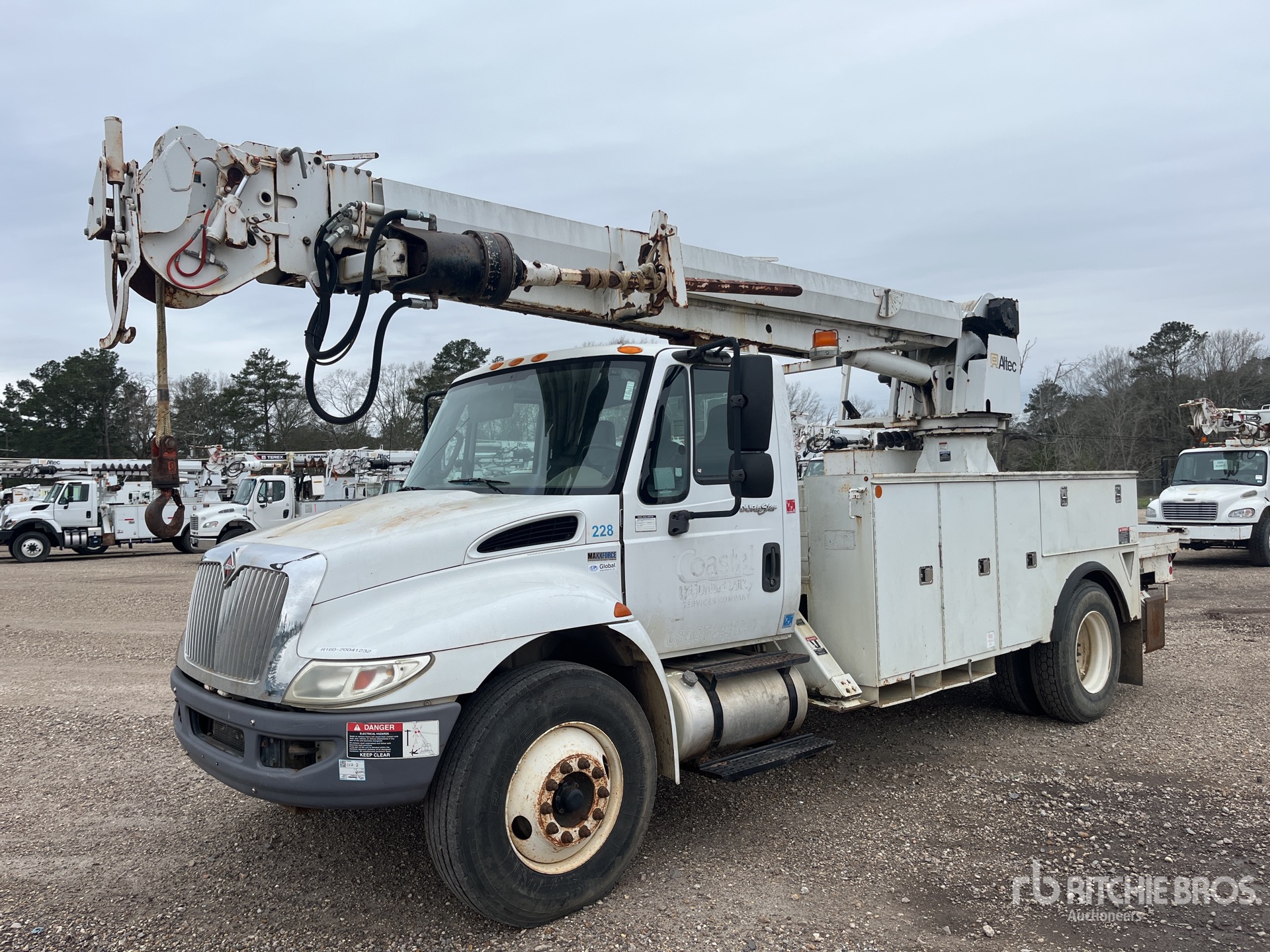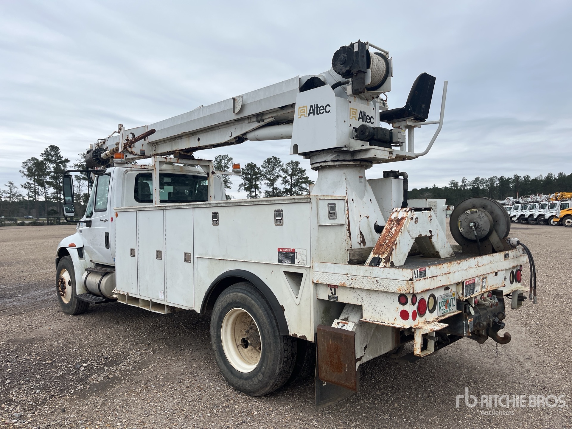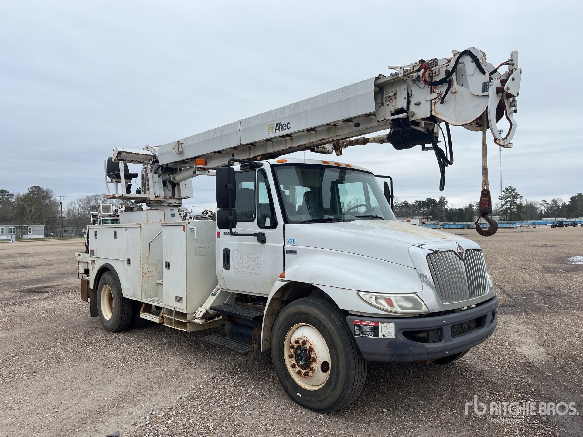 International 6 Cylinder Diesel Engine, 2011 US EPA Label, 5676 Engine hrs, Automatic Transmission, 13000 lb Front Axle, 20000 lb Rears, 33000 lb GVWR, 11R22.5, Spring Suspension, 190 in Wheelbase, PTO, Rear Mounted, Boom Tip Mounted Winch, Altec Body, A-Outriggers, Hydraulic Hose Reel