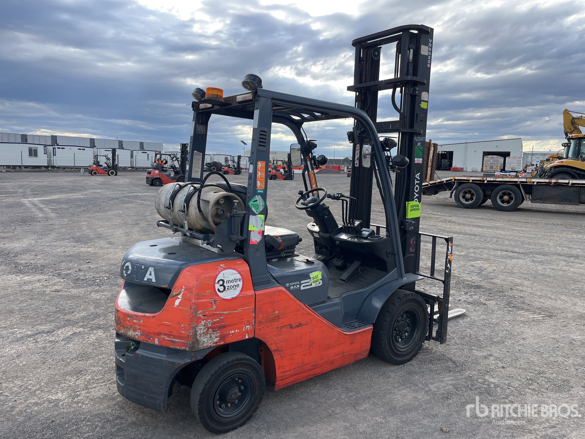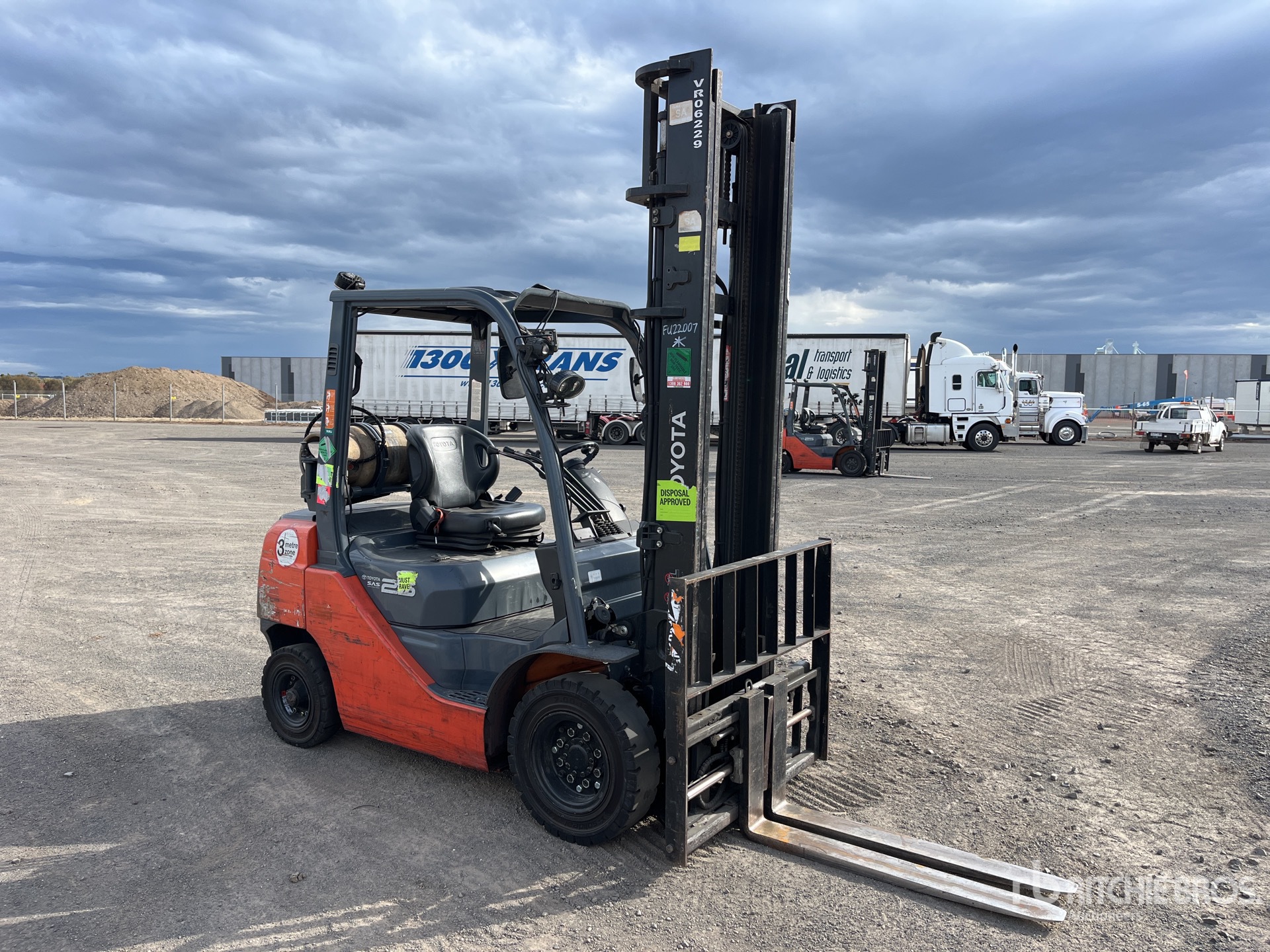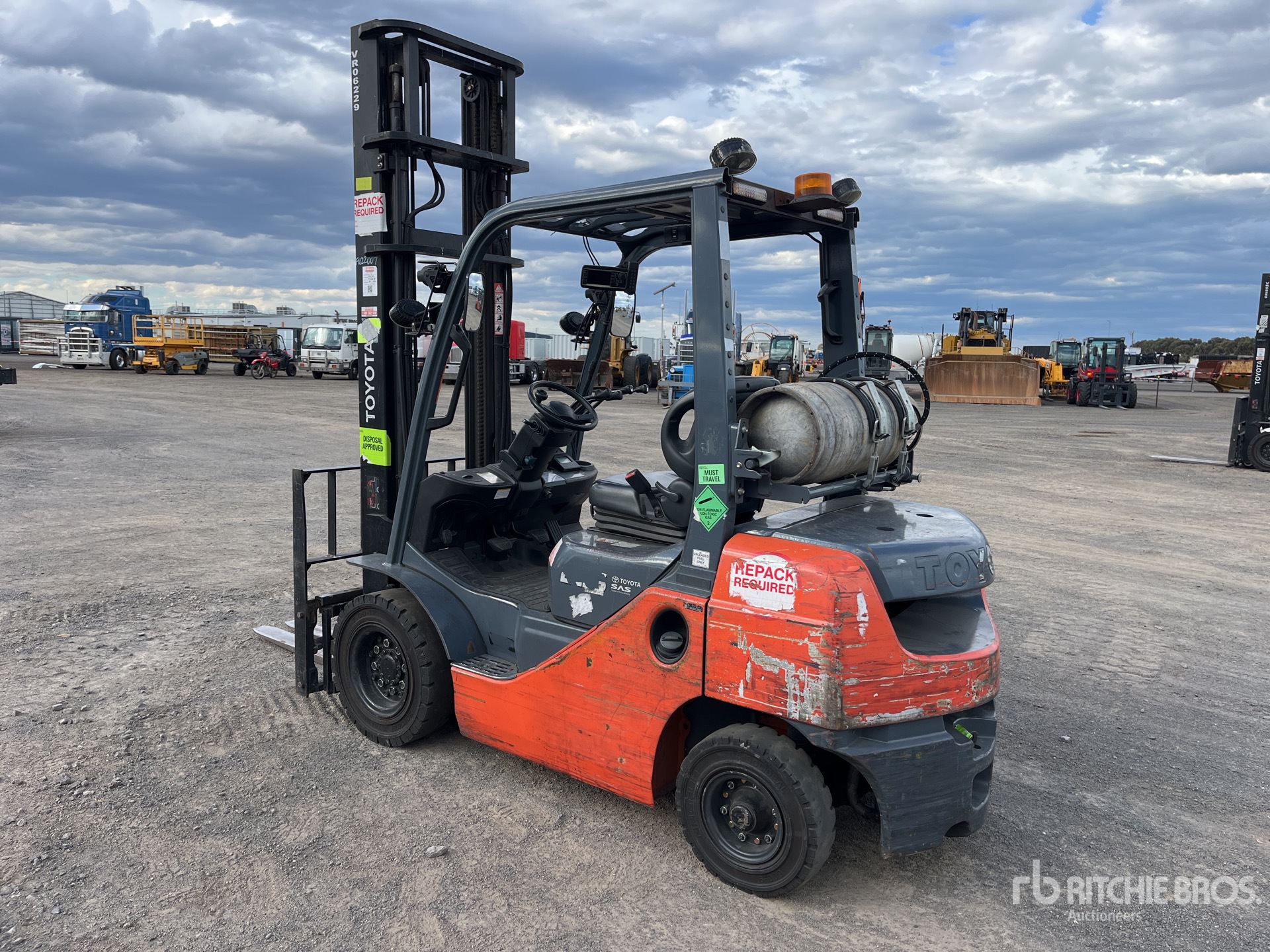 2 Stage Mast, 4500 mm Max Lift Height, 2800 mm Lowered Mast Height, 1070 mm Forks, Side Shift, Fork Positioner, Solid Pneumatic Tires, Toyota 4 Cylinder Dual Fuel Engine