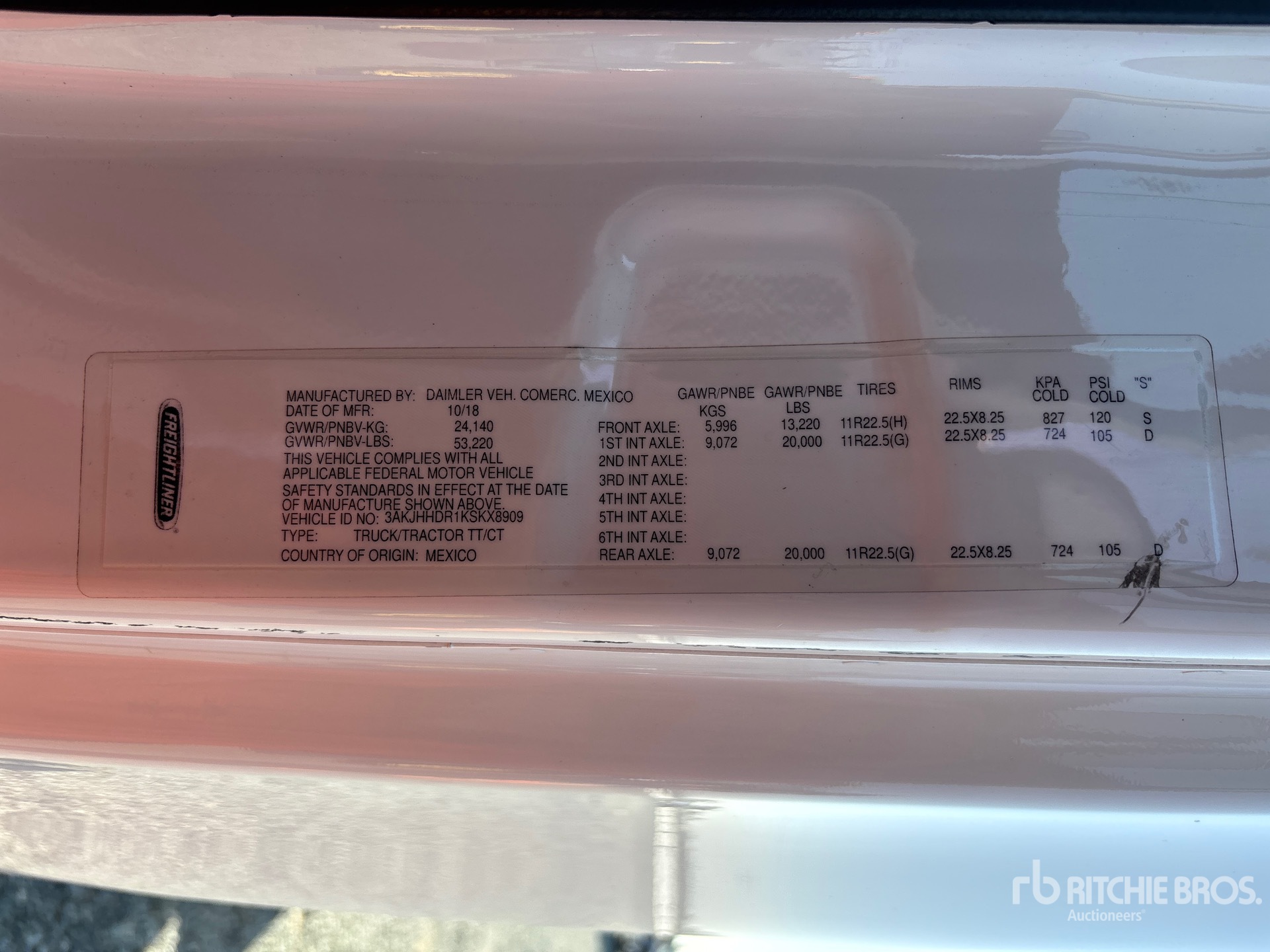Detroit DD15 455 hp Engine, 2019 US EPA Label, 17625 Engine hrs, Detroit DT12-1750-OH1 12-Speed Automated Transmission, 12000 lb Front Axle, 40000 lb Rears, 52000 lb GVWR, Engine Brake, 72 in High Rise Sleeper Cab, Bunk Beds, 233 in Wheelbase, Air Suspension, Aluminum Wheels, 11R22.5, Air Sliding 5th Wheel, Dual Fuel Tanks