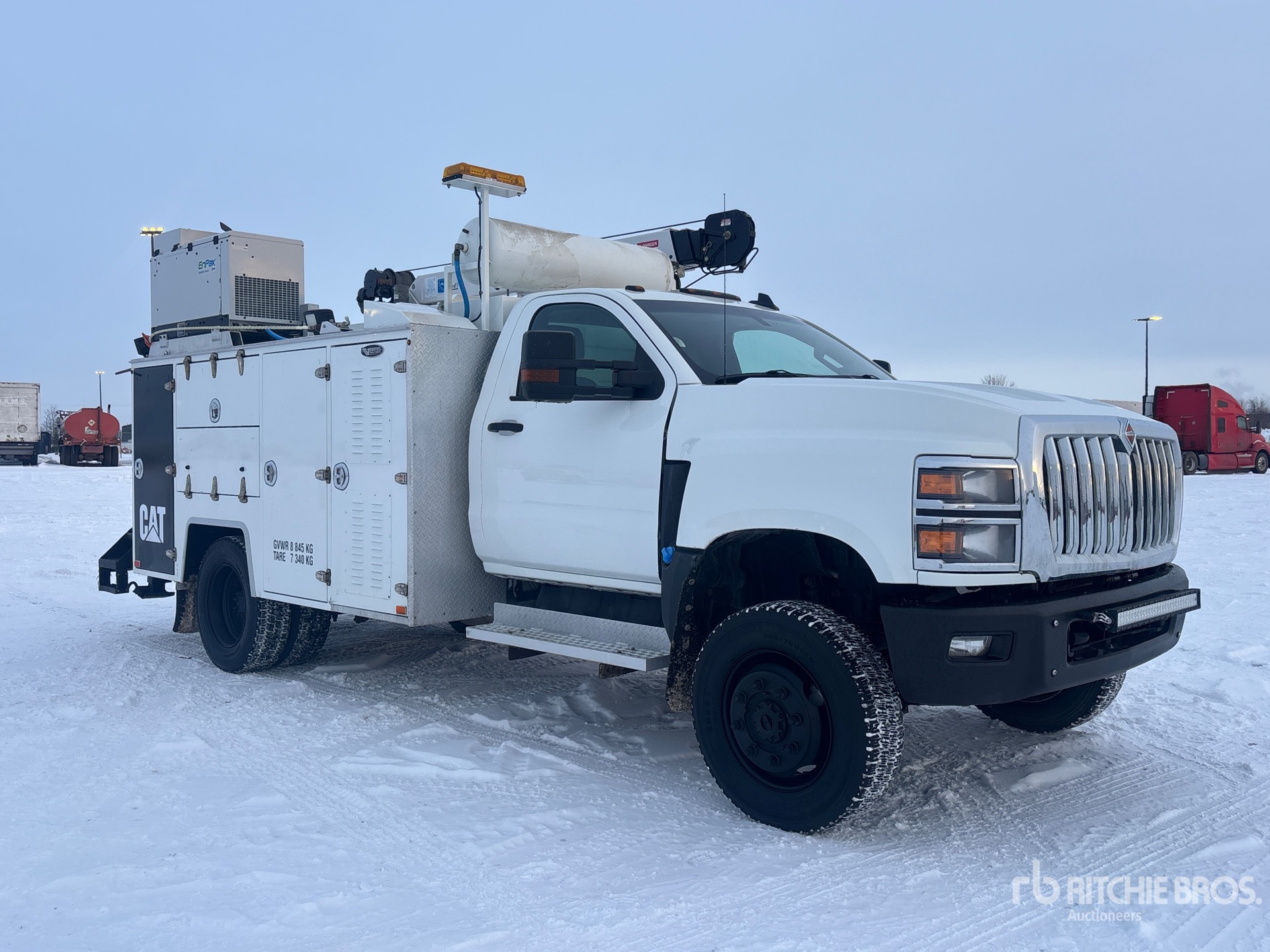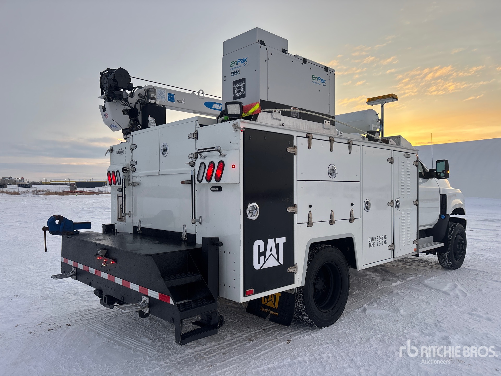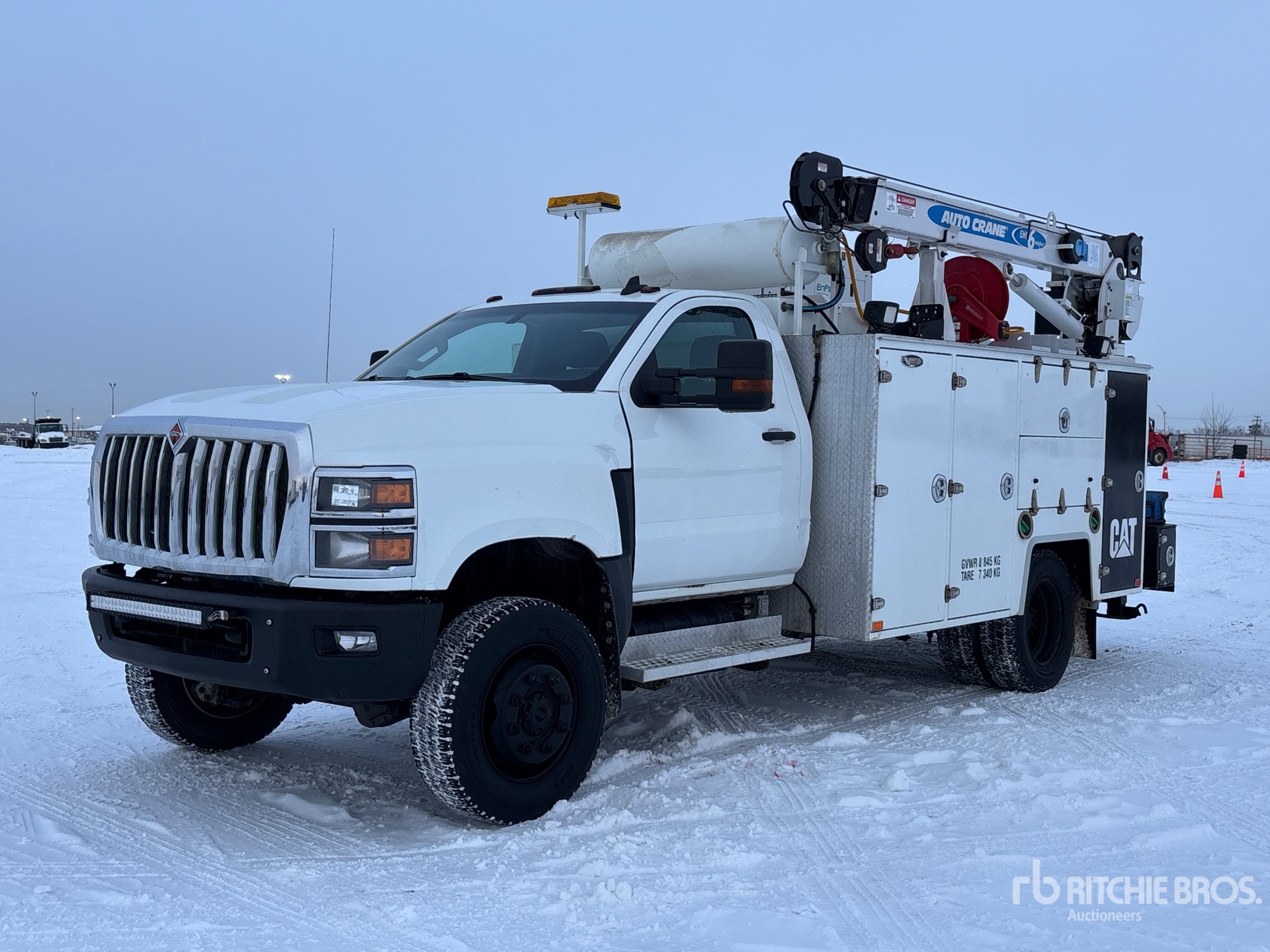 Duramax 6.6 L Diesel Engine, 2019 US EPA Label, CARB Compliant, Requires Diesel Exhaust Fluid, Automatic Transmission, 7500 lb Front Axle, 6803 lb Rears, 22500 lb GVWR, 245/70R19.5, Spring Suspension, 167 in Wheelbase, Brutus 11 ft Body, Auto Crane 6006EH 3 Section Hydraulic Crane, Wireless Remote Control, EnPak A28 GBW Diesel Air Compressor, Air Hose Reel, EnPak Stick Welder