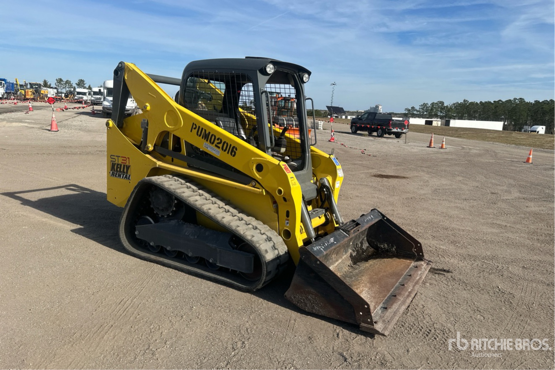 Located in Lane 19 Spot 223, Enclosed Cab (Door missing), Joystick Steering, 16 in Track Belts, Manual Coupler, 73 in Bucket, Equipment-from-Kelly-Tractor