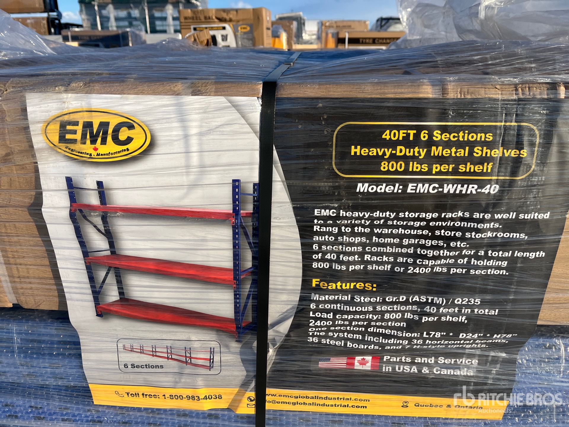 Industrial heavy-duty storage racks are well suited to a variety of storage environments. 6 sections combined together for a total length of 40 feet. Racks are capacity of holding 800 lbs per shelf.