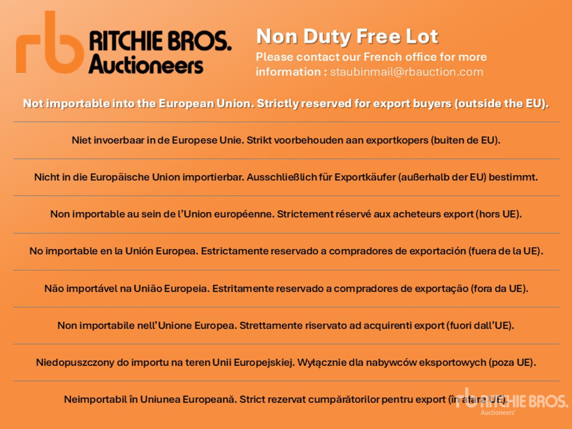 การวัดเป็นเพียงการประมาณการเท่านั้น ขนาดที่บรรทุกจริงอาจแตกต่างกันไปตามความสูงของรถบรรทุก/รถพ่วง และการกำหนดค่า/ตำแหน่งของเครื่องที่บรรทุก เป็นความรับผิดชอบของผู้ซื้อในการวัดน้ำหนักทั้งหมดก่อนออกจากสถานที่ประมูลของเรา เพื่อให้แน่ใจว่าน้ำหนักบรรทุกนั้นปลอดภัยสำหรับการขนส่ง การวัดทั้งหมดควรได้รับการตรวจสอบโดยผู้ซื้อ อย่าพึ่งพาการวัดเหล่านี้เพื่อวัตถุประสงค์ในการขนส่ง