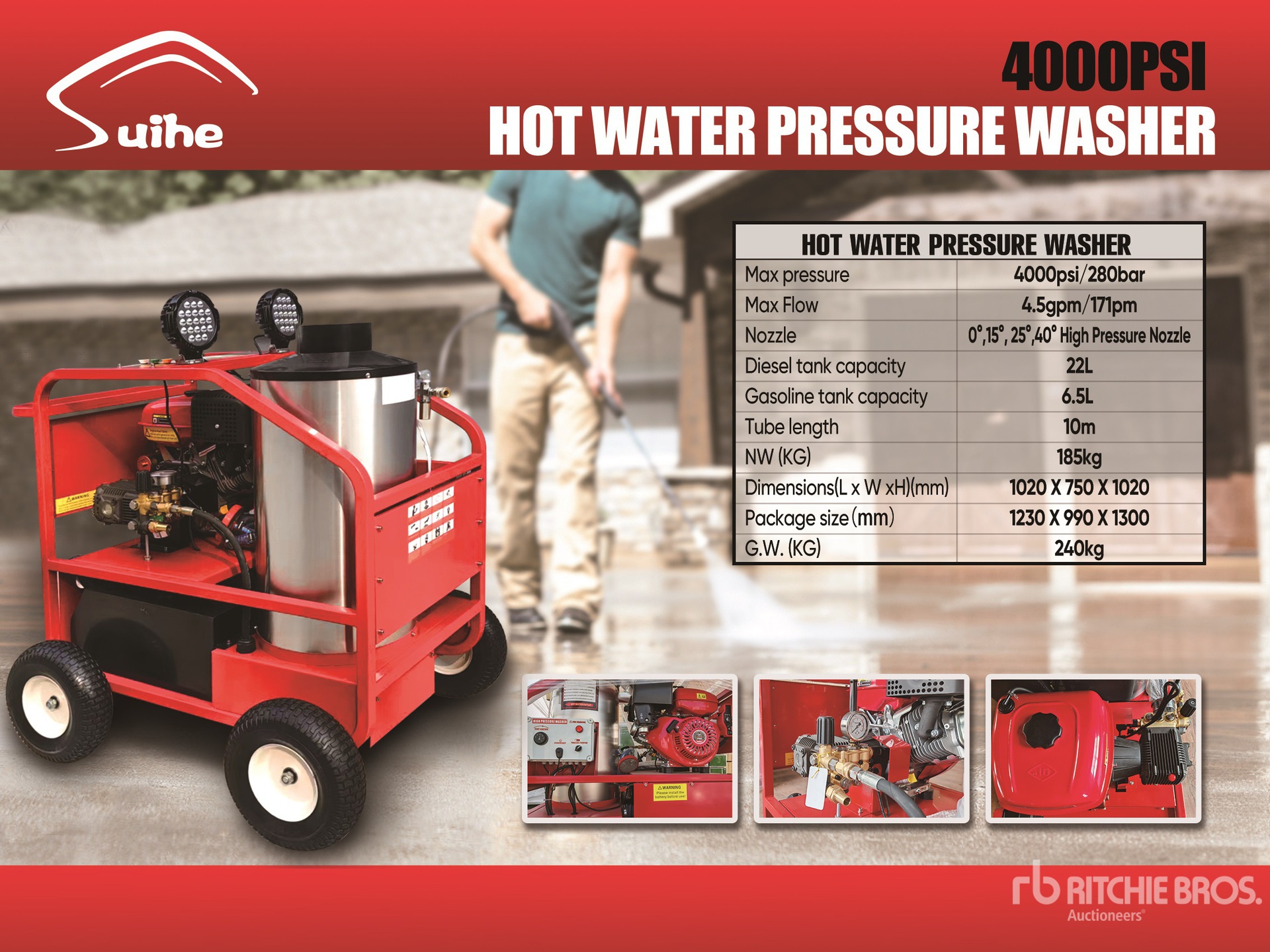 4000 psi Rating, Water Heater, Hose, Spray Wand, 1 Cylinder Gasoline Engine