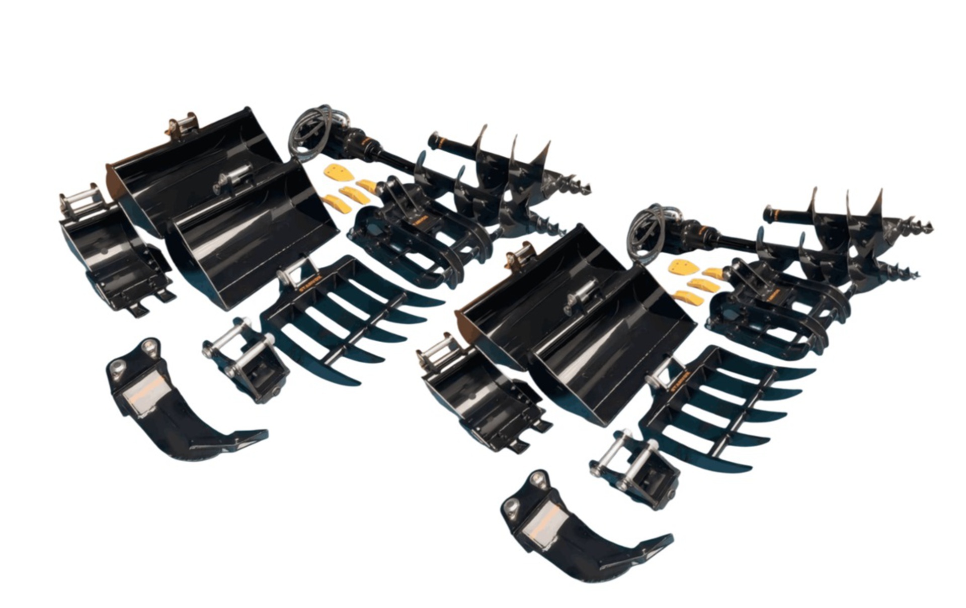 (2) 8 in Digging Buckets, (2) 24 in Cleanup Buckets, (2) 32 in Cleanup Buckets, (2) Augers w/ (2) 8 in & 12 in Auger Bits, (2) Quick Couplers, (2) Rakes, (2) Rippers, (2) Grapples, (2) Sets of Bucket Teeth & Side Cutters