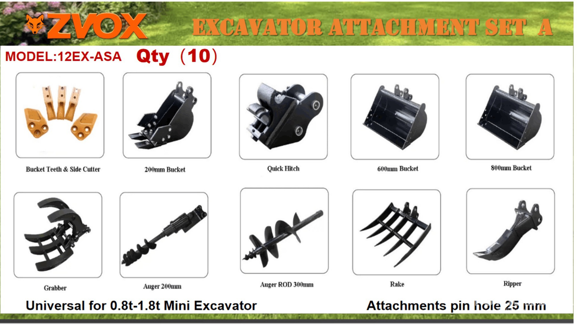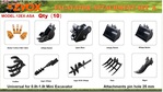 (1) 8 in Digging Bucket, (1) 24 in Cleanup Bucket, (1) 32 in Cleanup Bucket, (1) 8 in Auger, (1) 12 in Auger, (1) Quick Coupler, (1) Rake, (1) Ripper, (1) Grapple, (1) Set of Bucket Teeth & Side Cutters