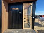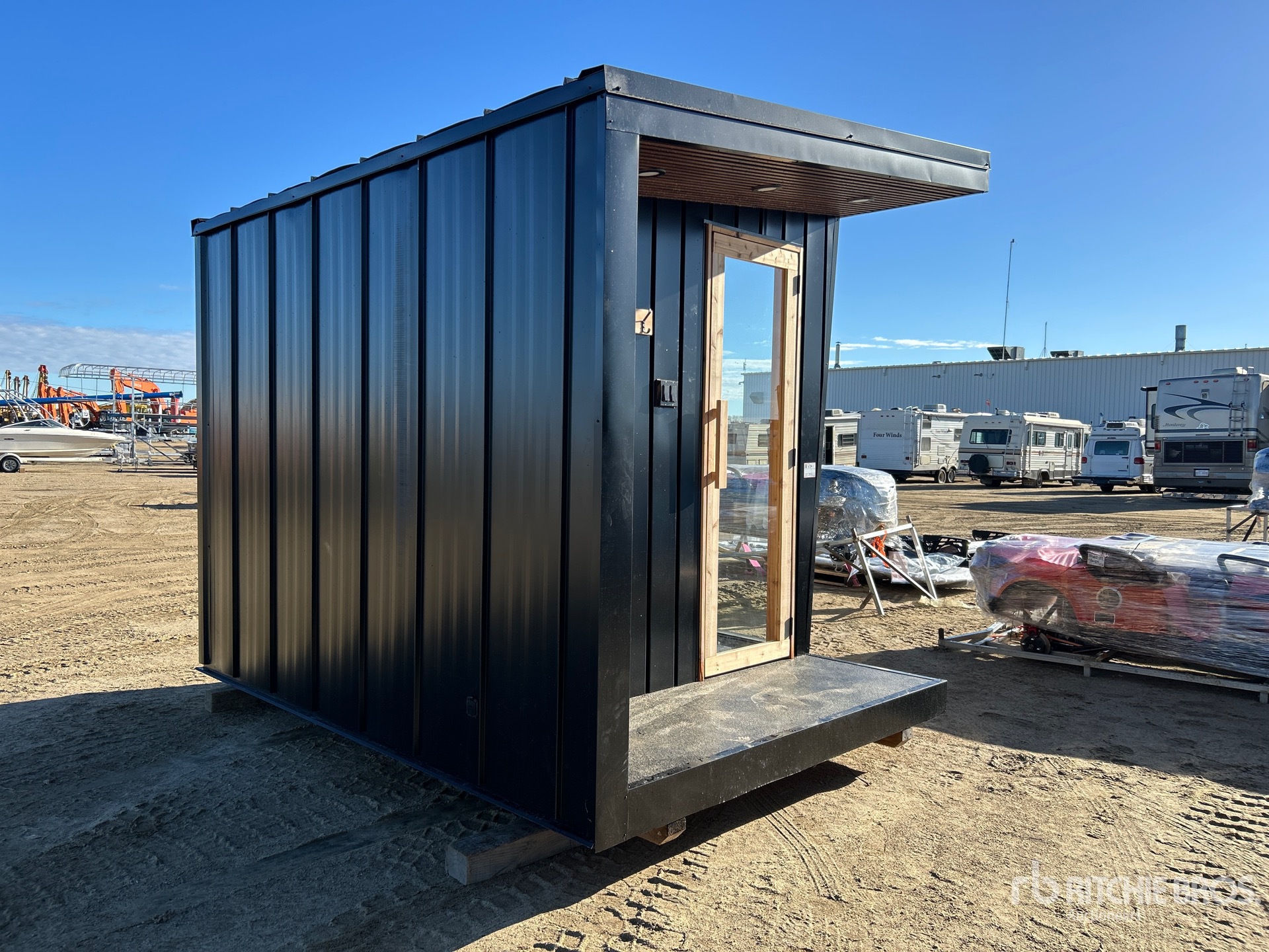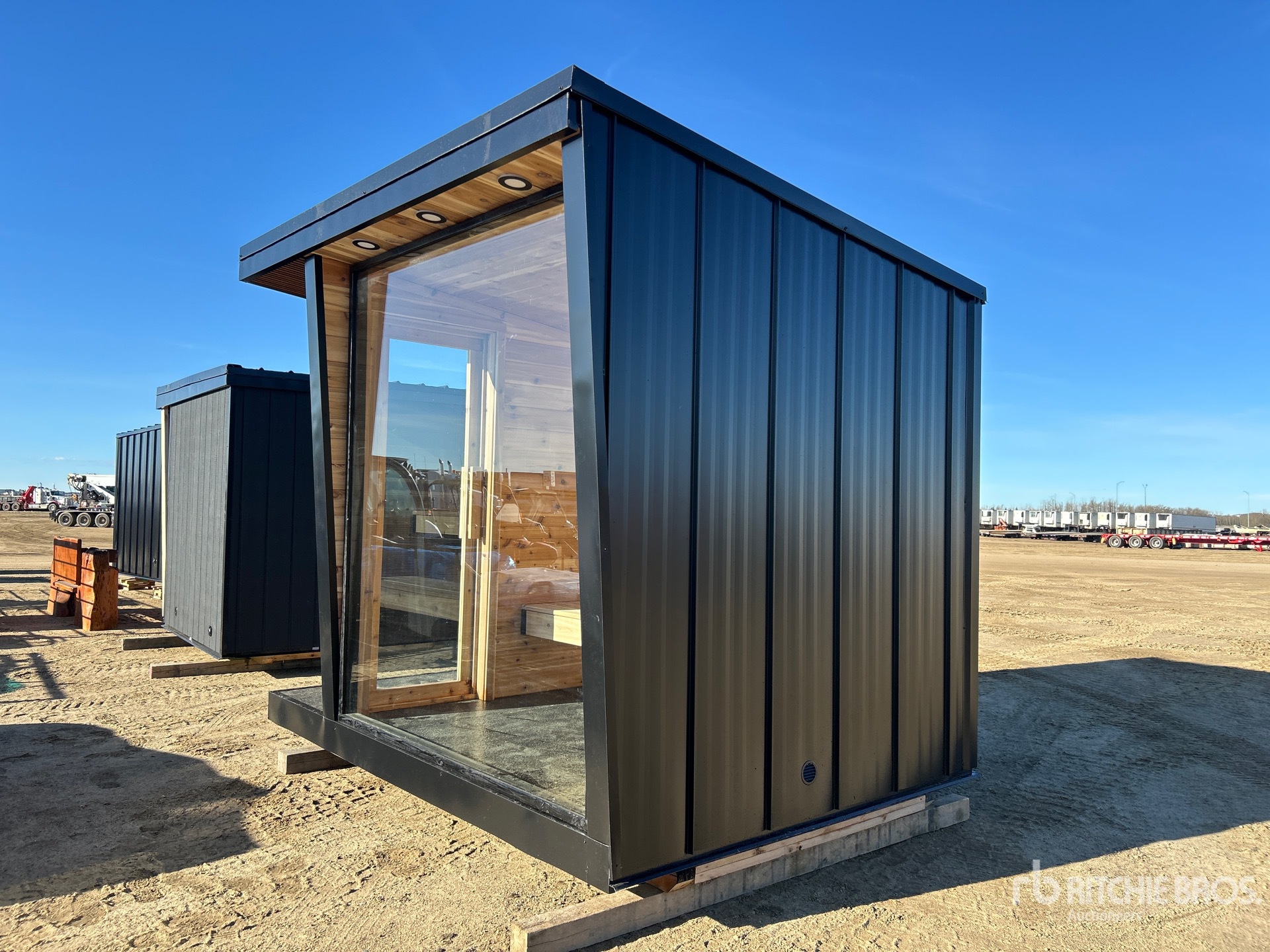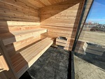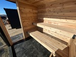 Fully insulated, modern outdoor sauna built for comfort and durability. Designed to seat 4-6 people, it delivers powerful heat and a premium finish inside and out. The exterior features a sleek metal roof and walls, built on heavy-duty skids for easy placement. Inside, you'll find full cedar walls, ceiling, and benches, creating that classic sauna look and aroma. A 9KW 220V heater provides fast, consistent heat, while 110V powers the lighting, including under-bench lighting and exterior pot lights with two modes. The tempered glass door and window add natural light and a clean, modern feel. Finished with a durable epoxy floor with grip flakes, this sauna is built to perform and built to last.