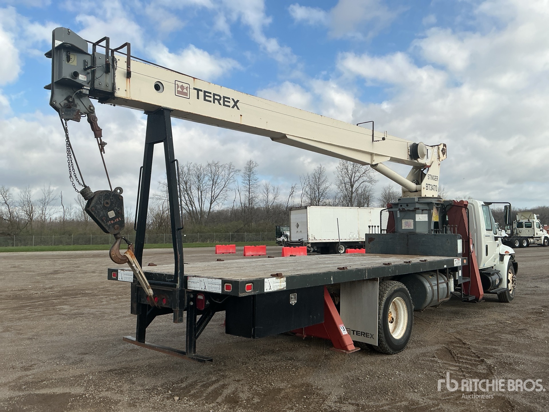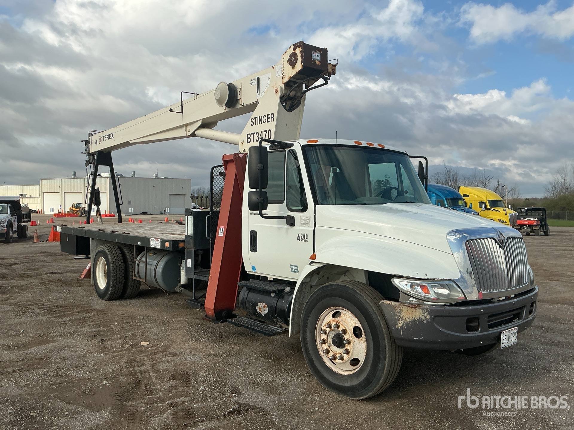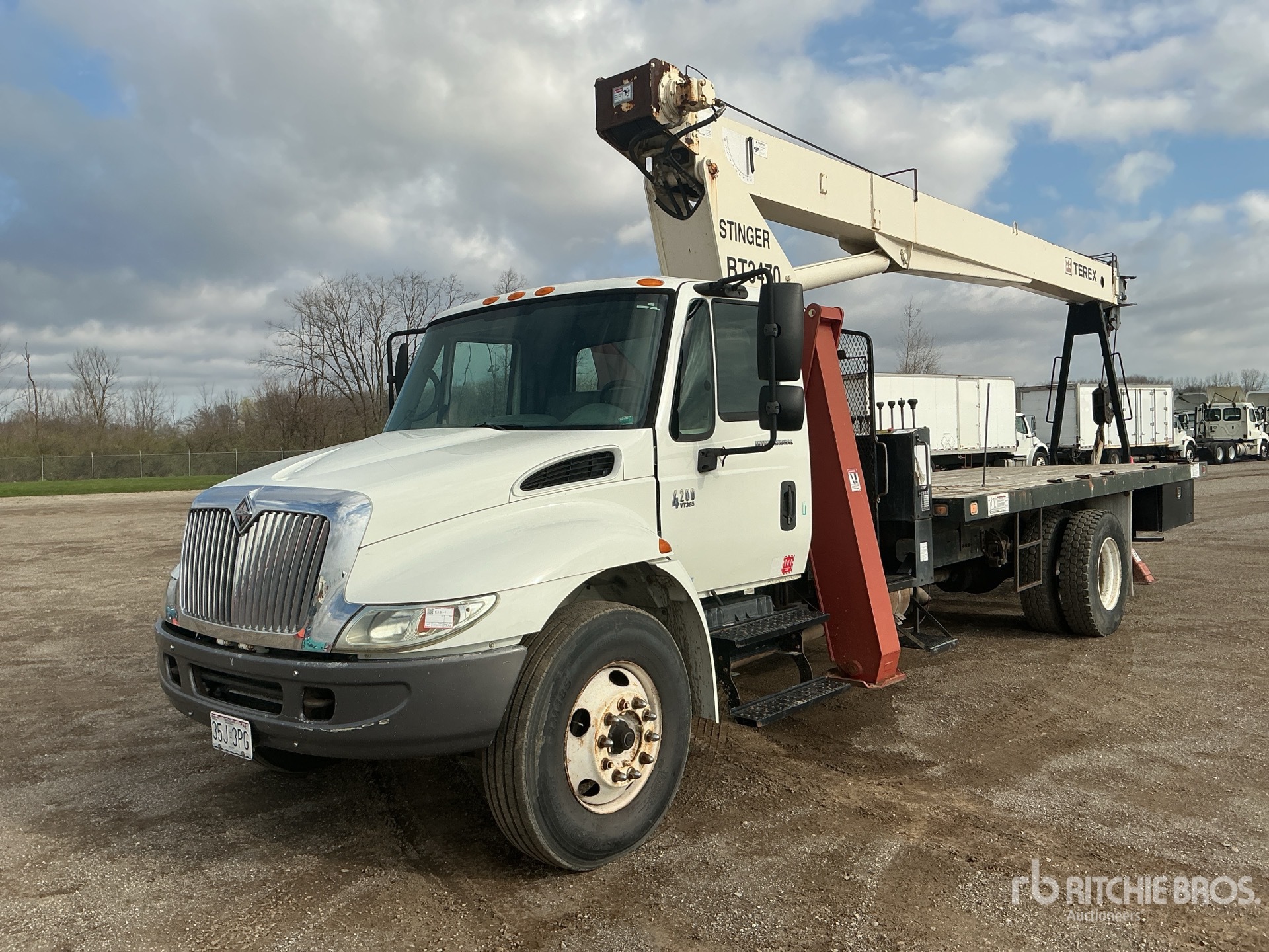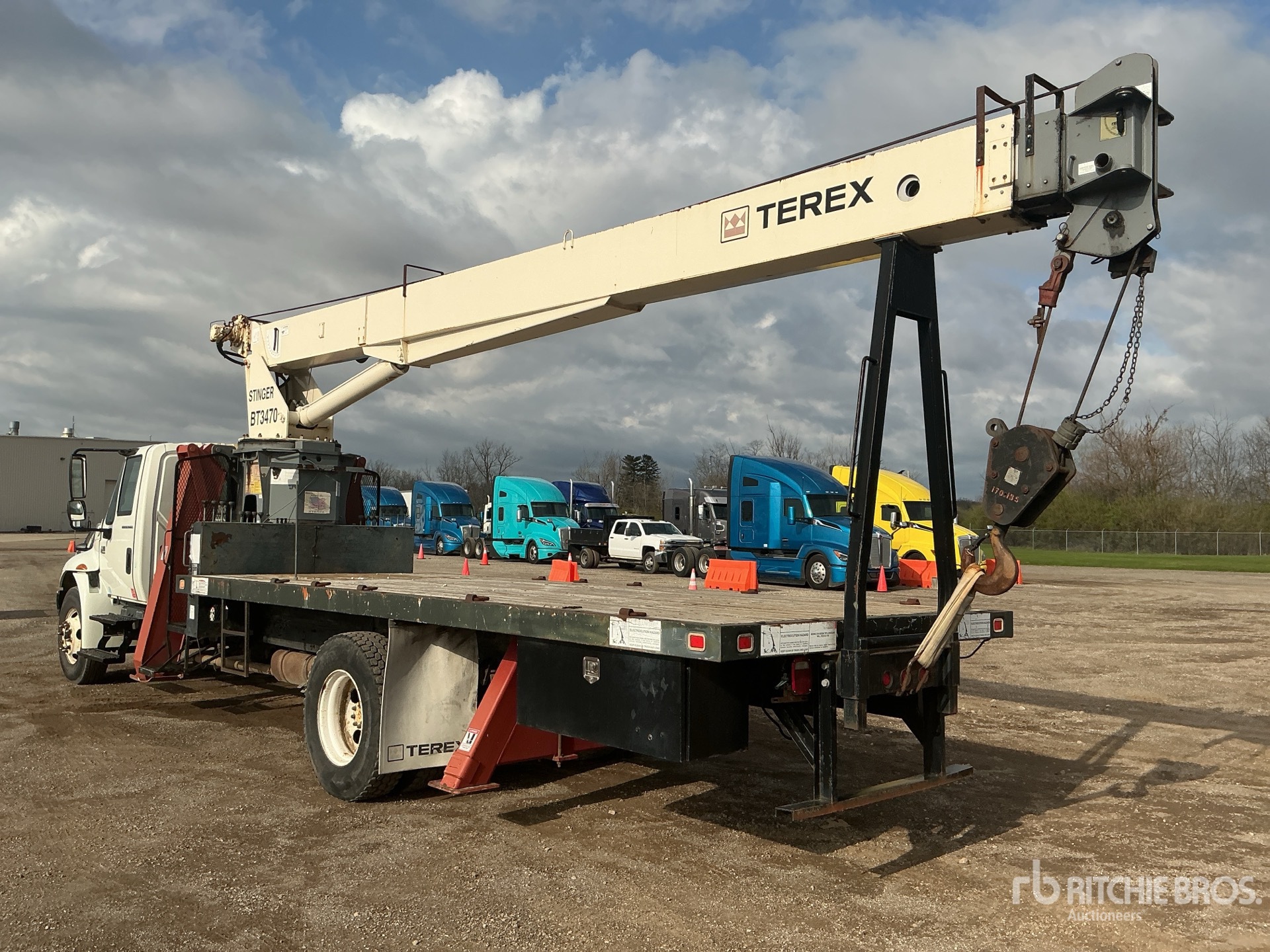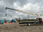 International VT365 V8 6 L Diesel 230 hp Engine, 3538 Engine hrs, Automatic Transmission, 11R22.5 Front Tires, 11R22.5 Rear Tires, Spring Suspension, 236 in Wheelbase, PTO, 27 ft - 70 ft 3 Section Boom, Terex 170 lb 1 Sheave 17.5 ton Capacity Hook Block w/ 0.5 in Wire Rope,, Dual Controls, Greer Company Load Moment Indicator, X-Type Outriggers, Rear Outriggers, Telex BT3470 34000 lb 33 Section Crane, 20 ft x 96 in Bed
