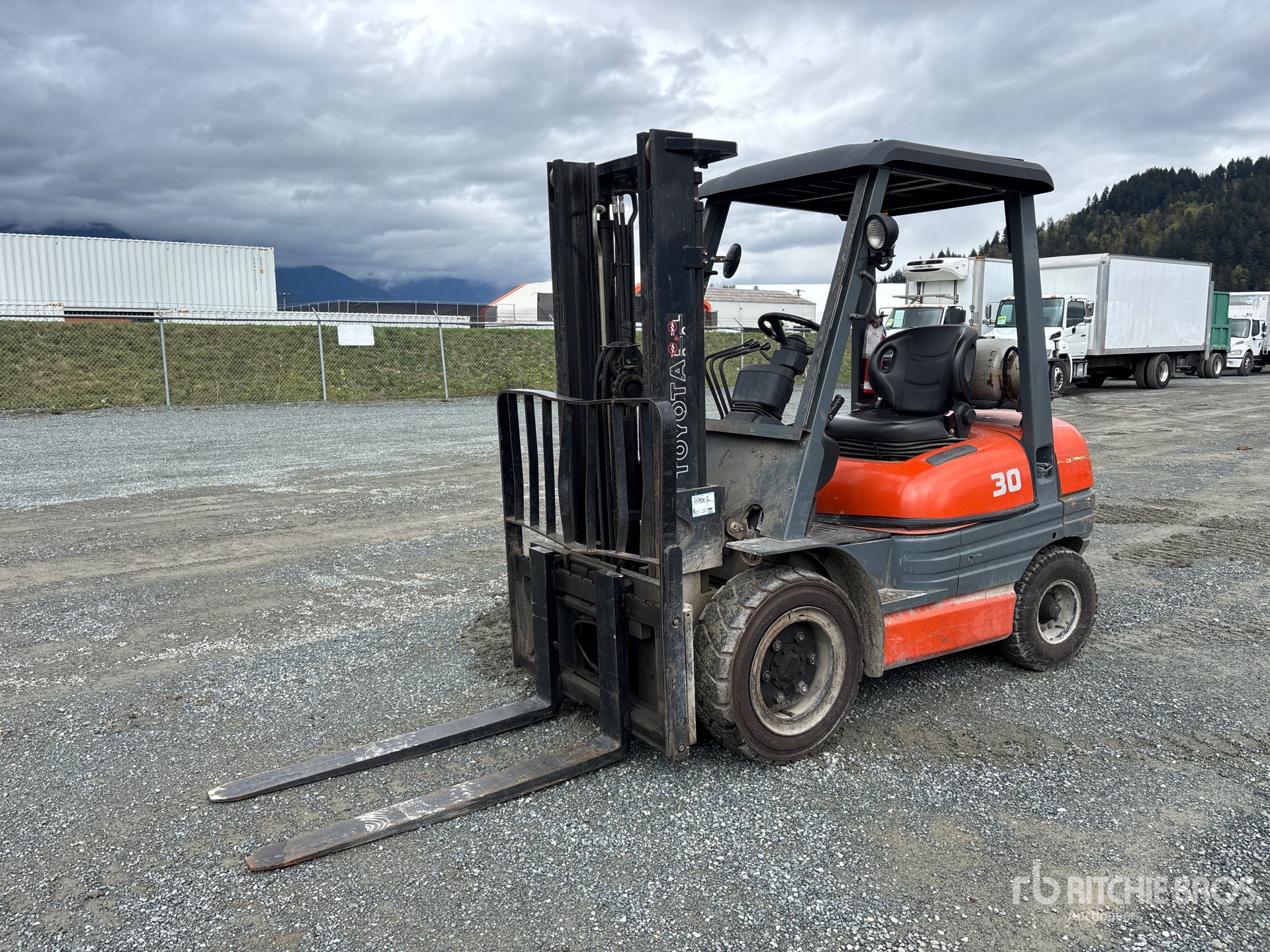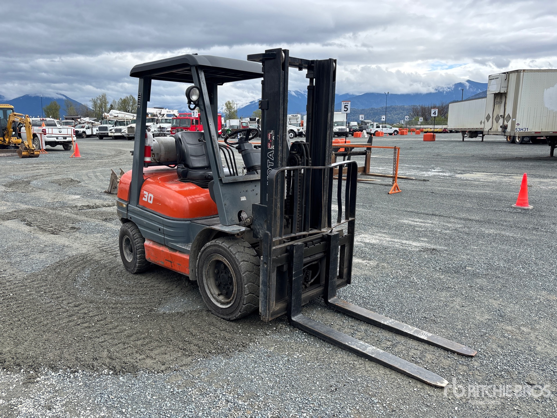2 Stage Mast, 131.5 in Max Lift Height, 84 in Lowered Mast Height, 48 in Forks, Side Shift, 4 Cylinder LPG Engine